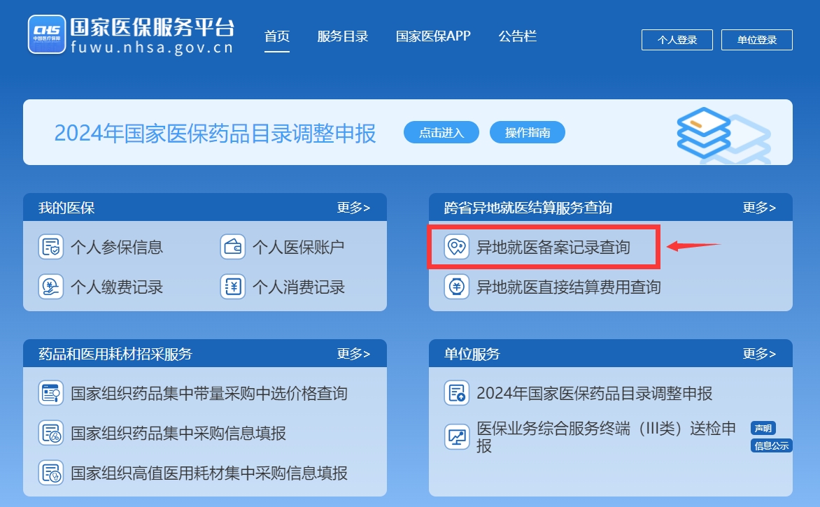 2、在“国家医保服务平台”网站首页“异地就医备案记录查询”处登录查询。