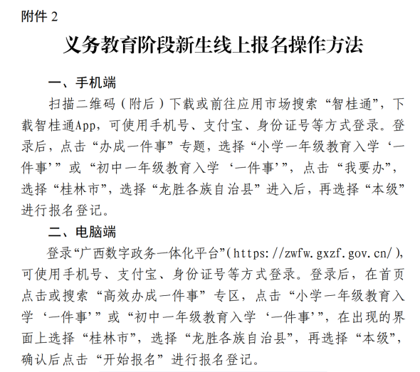 线下报名对象:非龙胜镇户籍且监护人在县城无房产的报读县城义务教育学校的适龄儿童少年。