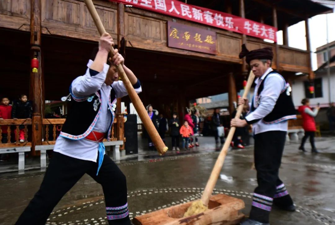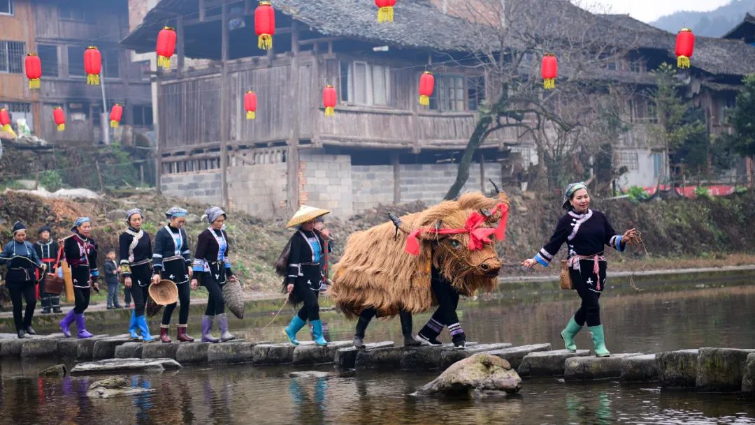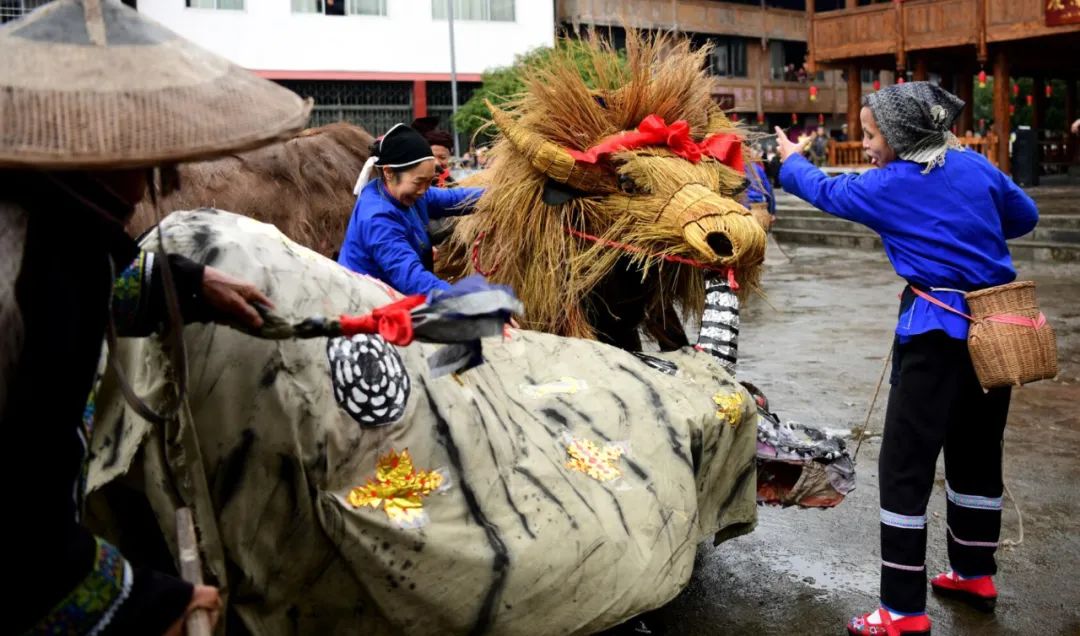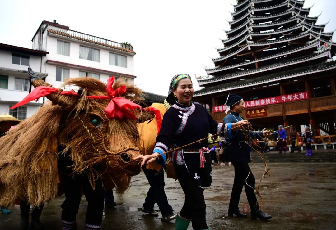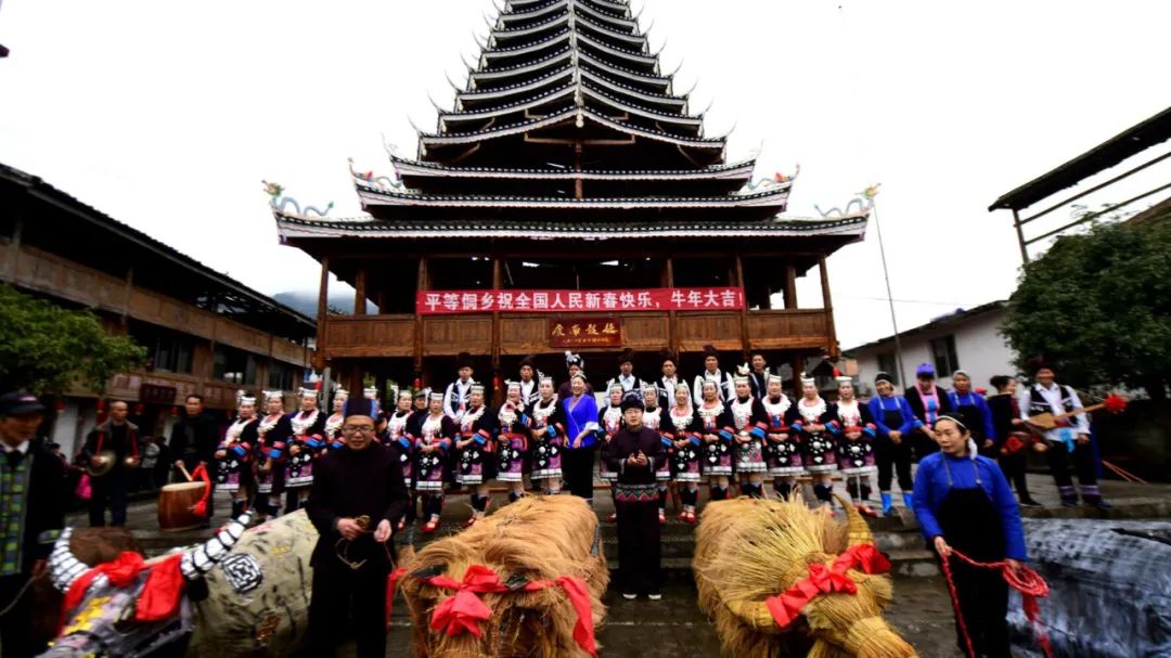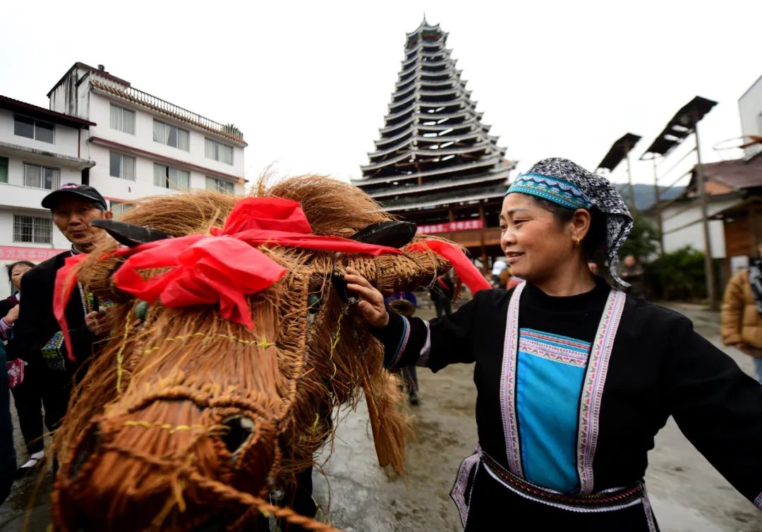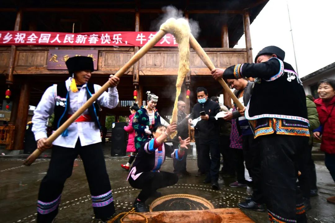2月3日,在龙胜各族自治县平等镇广南村鼓楼前,侗族群众身着盛装汇集到鼓楼前,以闹春牛、芦笙踩堂、琵琶歌舞、打糍粑等侗族特色活动闹新春,祈求五谷丰登,阖家幸福,以此拉开新年生产的序幕。