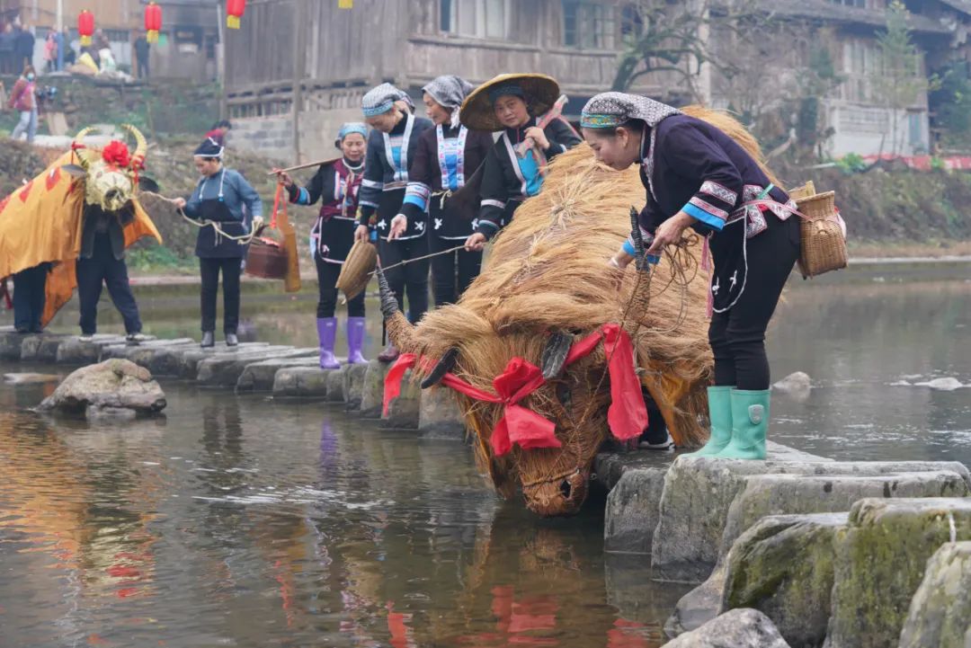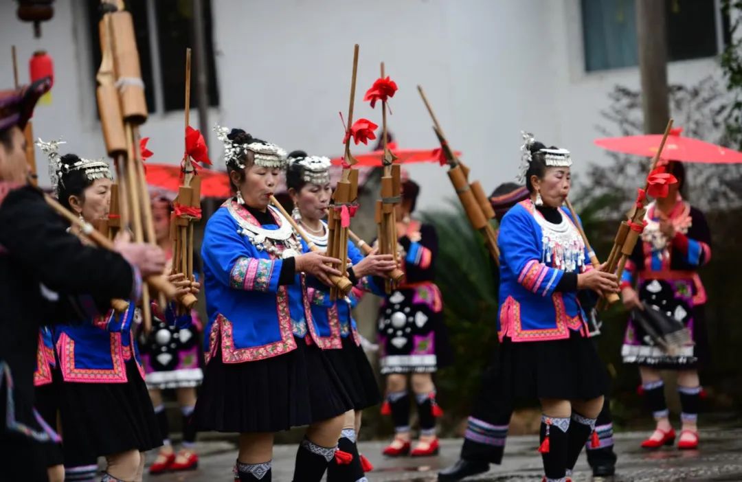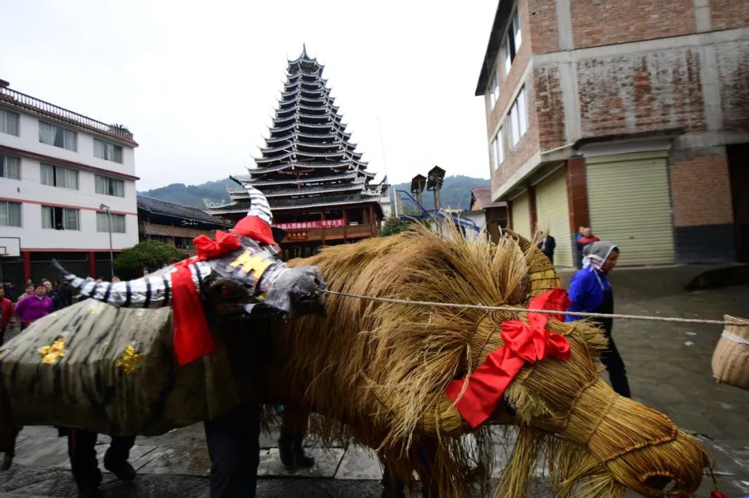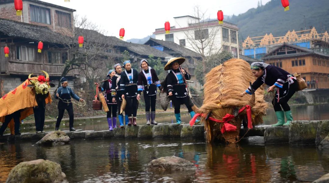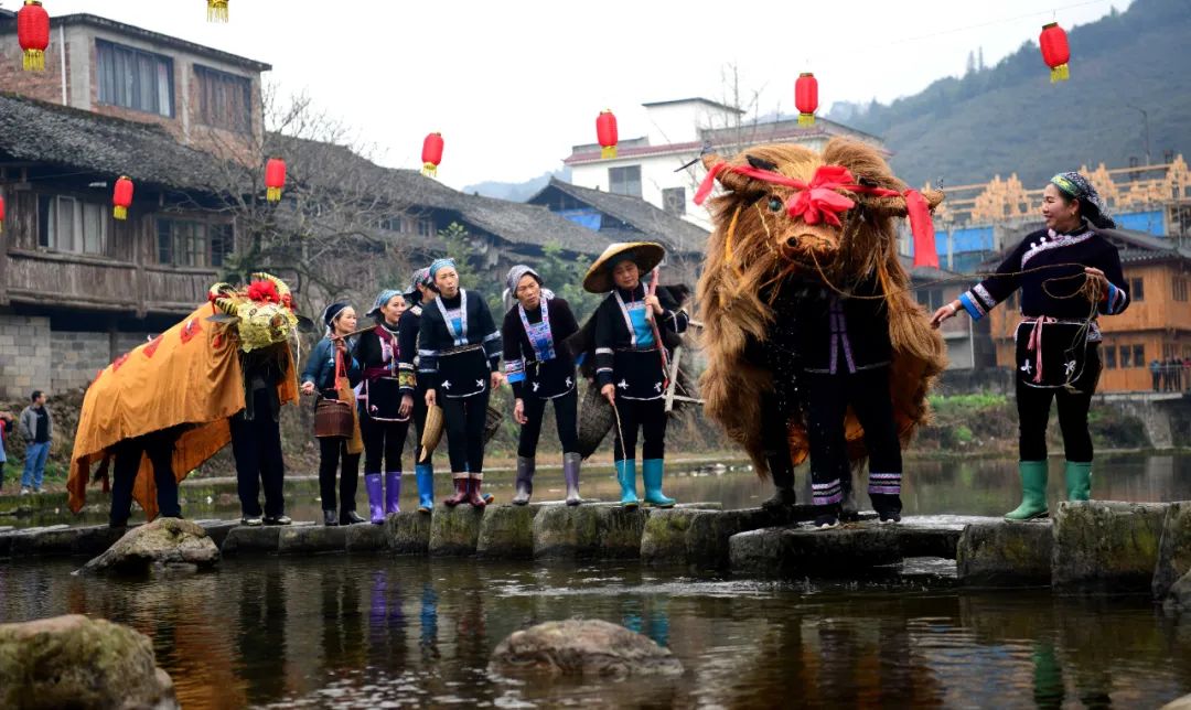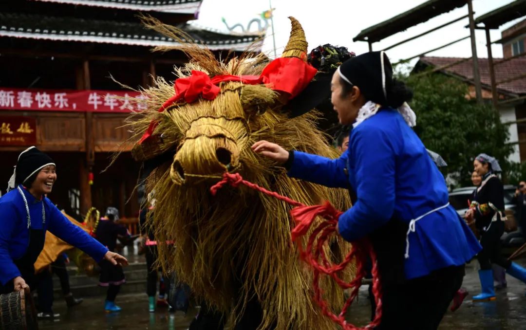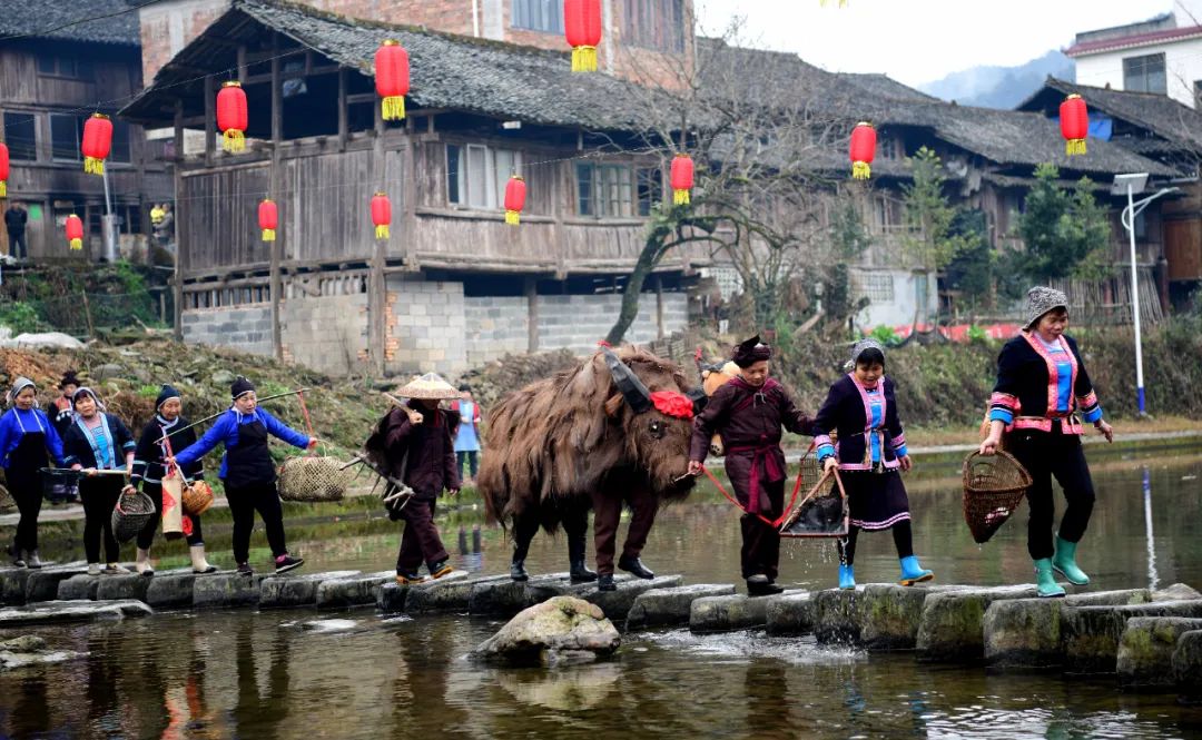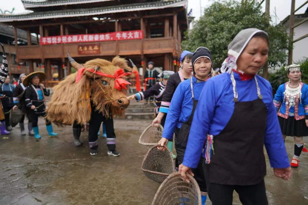 2月3日,在龙胜各族自治县平等镇广南村鼓楼前,侗族群众身着盛装汇集到鼓楼前,以闹春牛、芦笙踩堂、琵琶歌舞、打糍粑等侗族特色活动闹新春,祈求五谷丰登,阖家幸福,以此拉开新年生产的序幕。