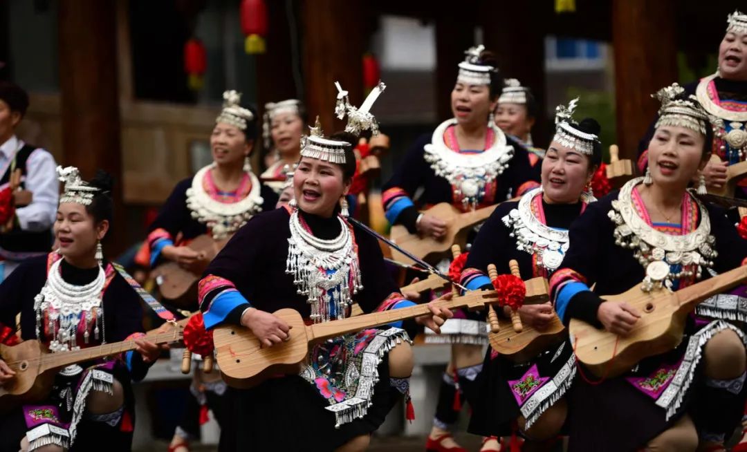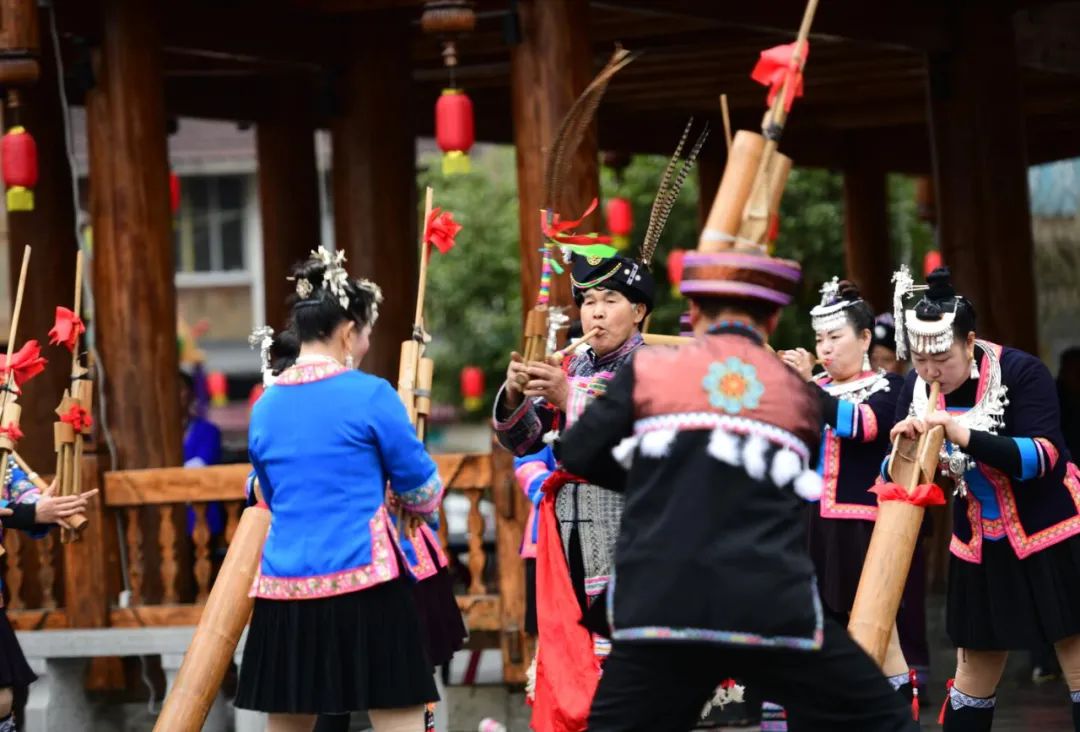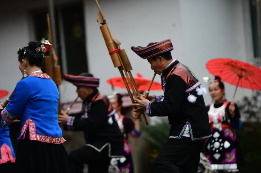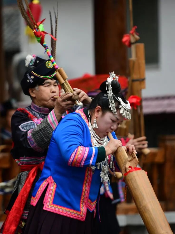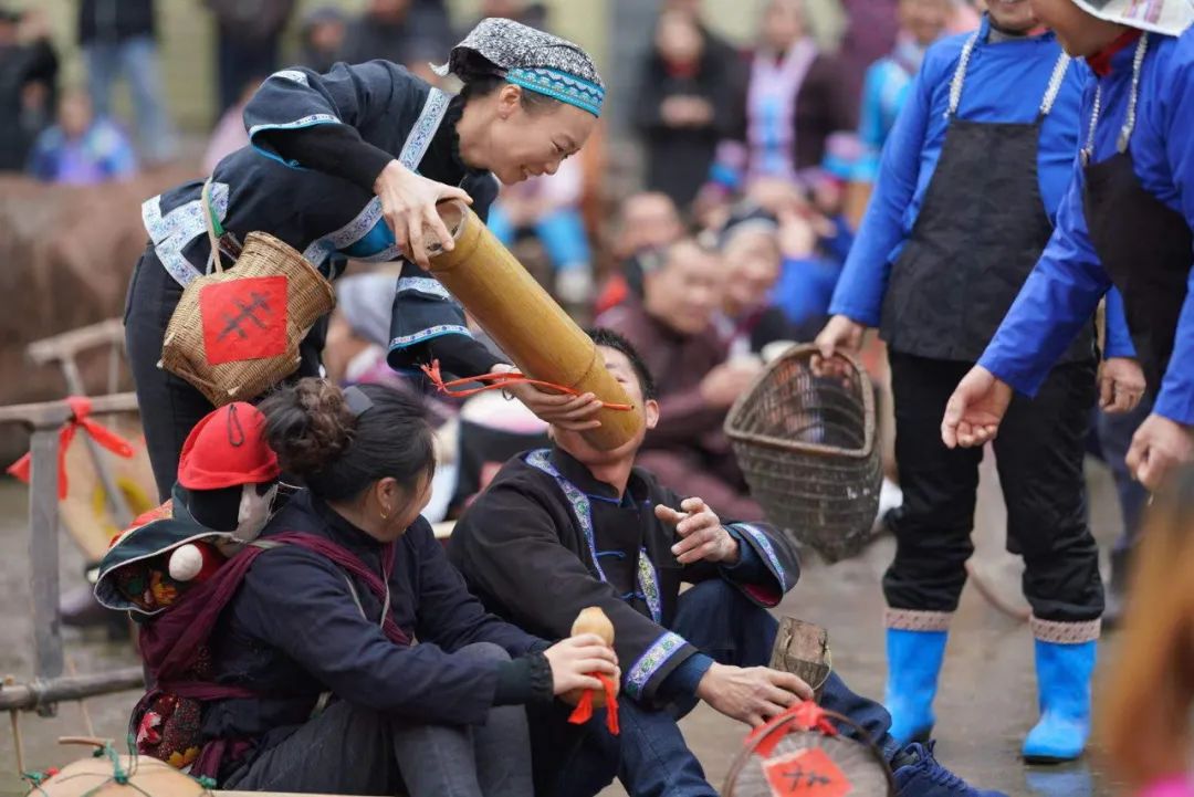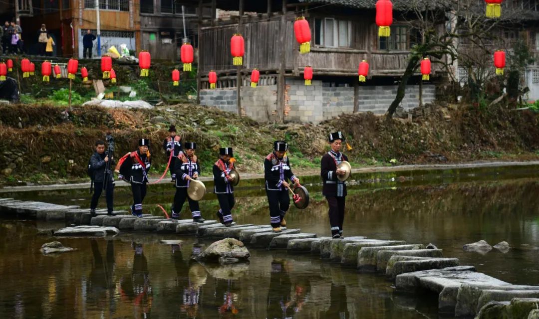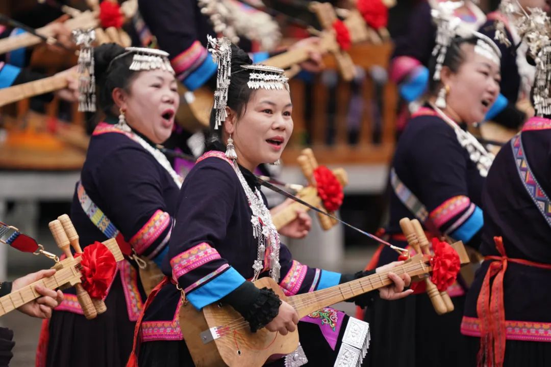 2月3日,在龙胜各族自治县平等镇广南村鼓楼前,侗族群众身着盛装汇集到鼓楼前,以闹春牛、芦笙踩堂、琵琶歌舞、打糍粑等侗族特色活动闹新春,祈求五谷丰登,阖家幸福,以此拉开新年生产的序幕。