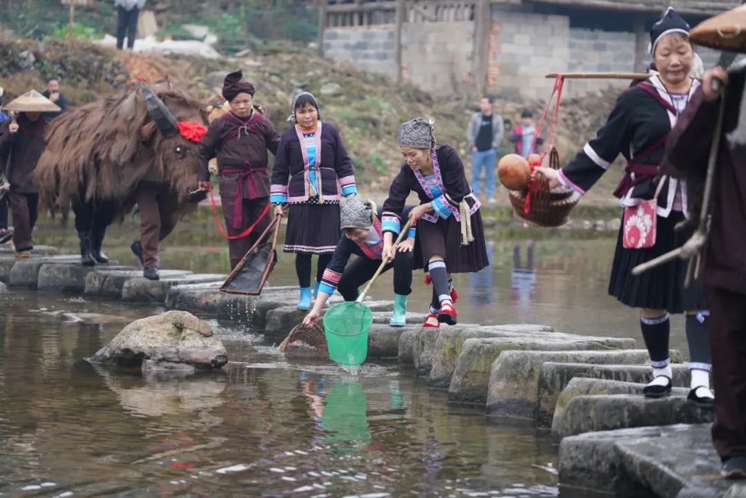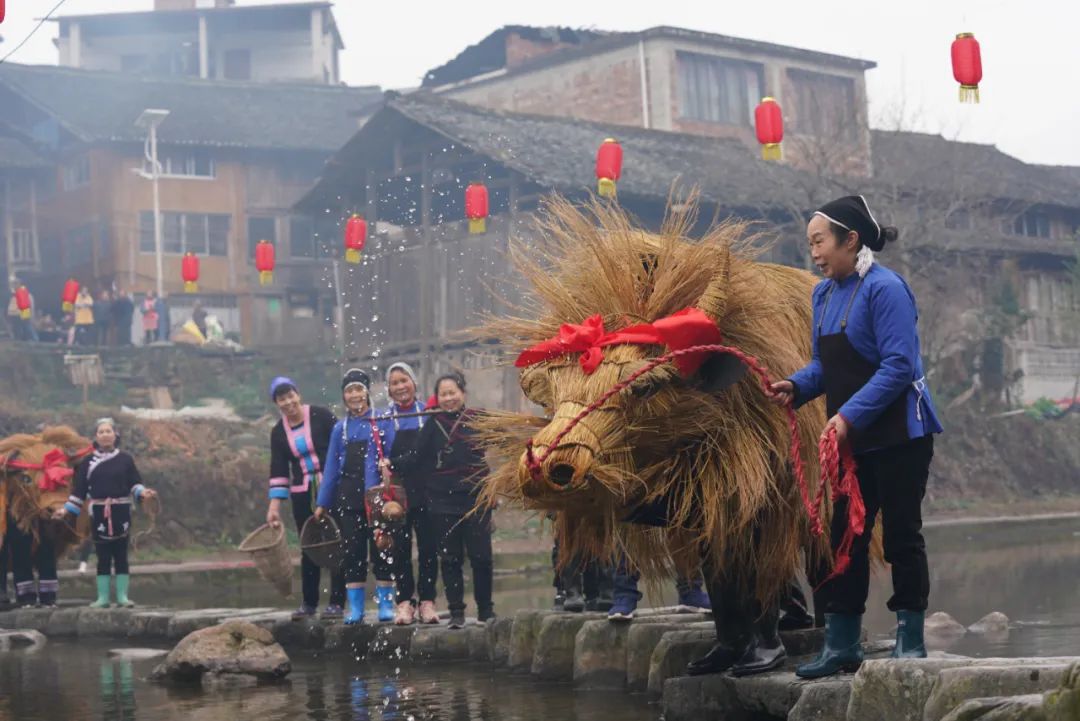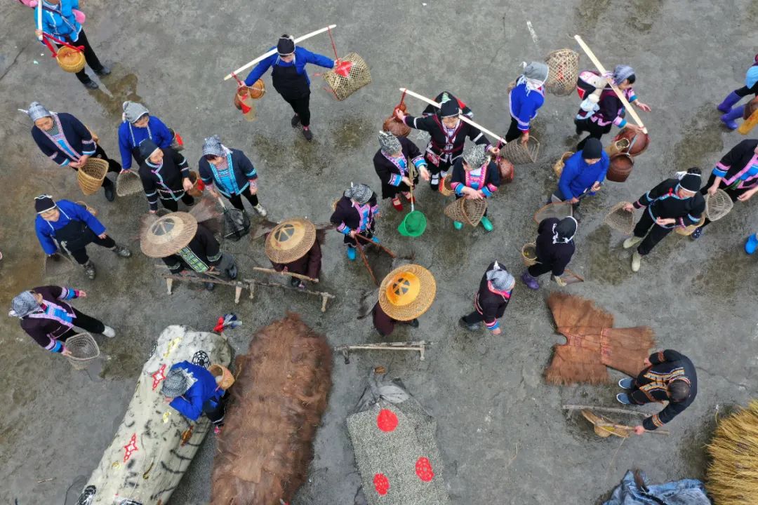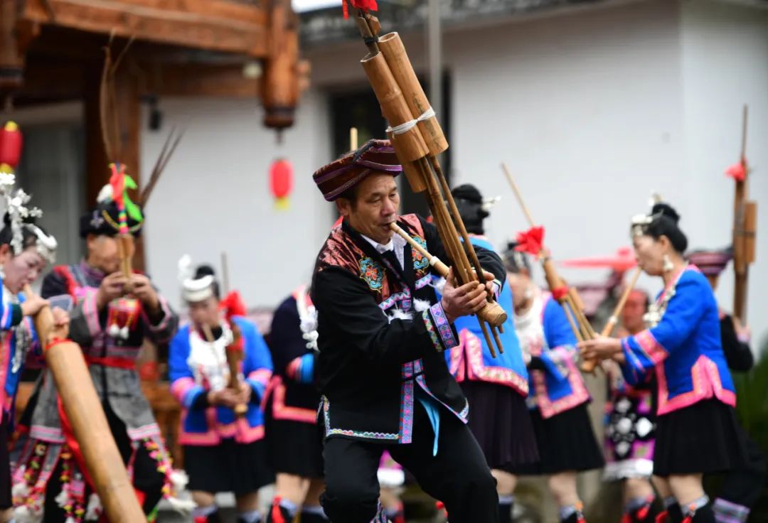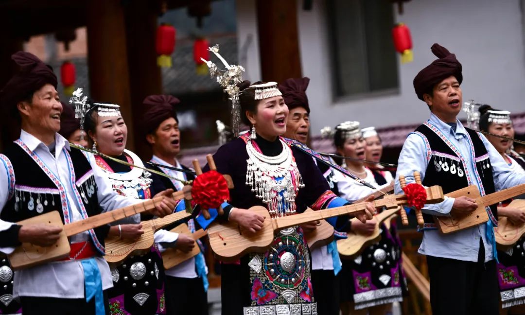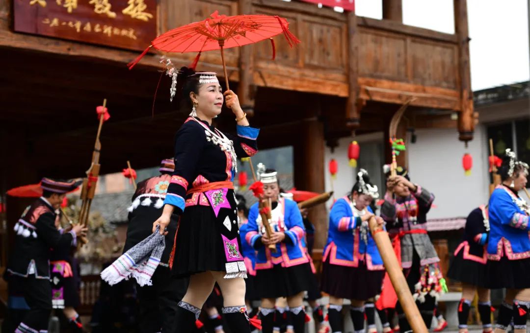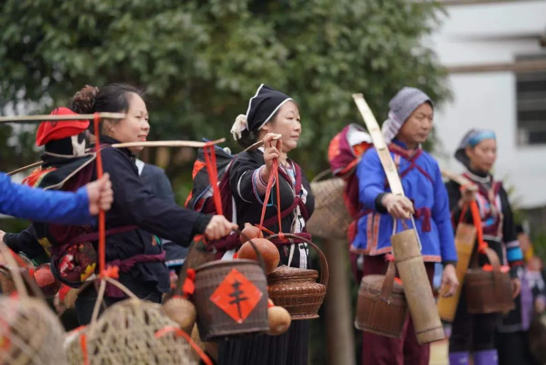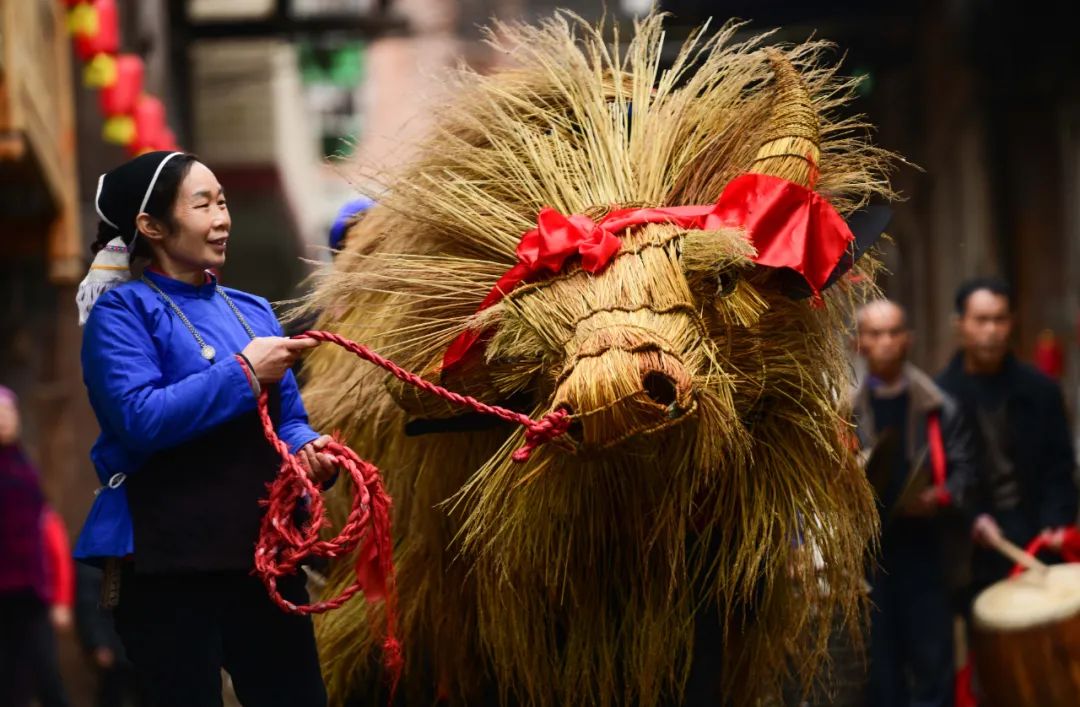 2月3日,在龙胜各族自治县平等镇广南村鼓楼前,侗族群众身着盛装汇集到鼓楼前,以闹春牛、芦笙踩堂、琵琶歌舞、打糍粑等侗族特色活动闹新春,祈求五谷丰登,阖家幸福,以此拉开新年生产的序幕。
