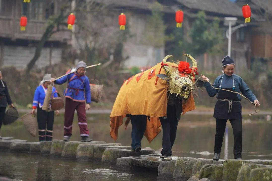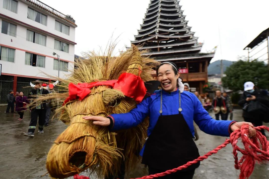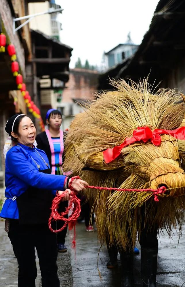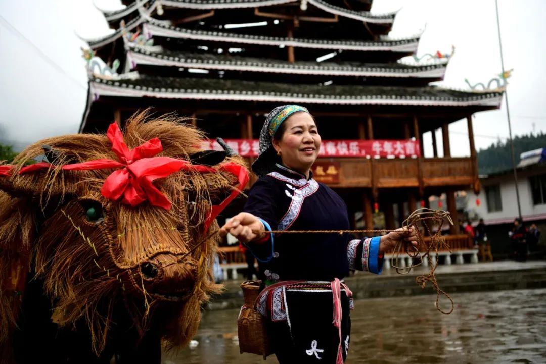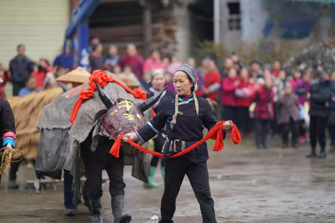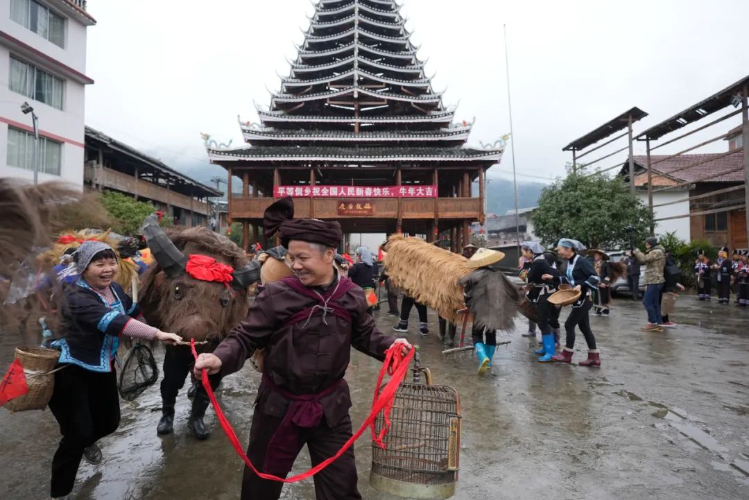 热闹的场面,增添了春节的喜庆气氛,闹春牛的人们为农家带来了节日的欢乐。侗族世代流传的闹春牛活动,是因为牛是侗族人们辛勤的帮手,所以家家户户,高高兴兴地放鞭炮迎接,祝福春天的到来,祈求来年风调雨顺、五谷丰登。