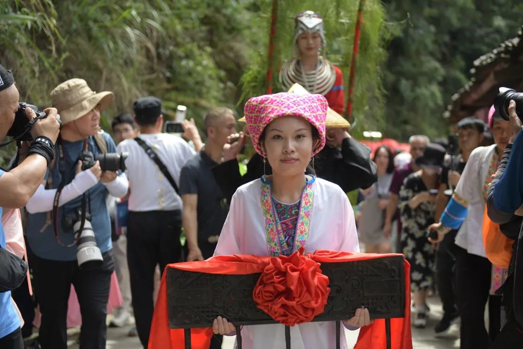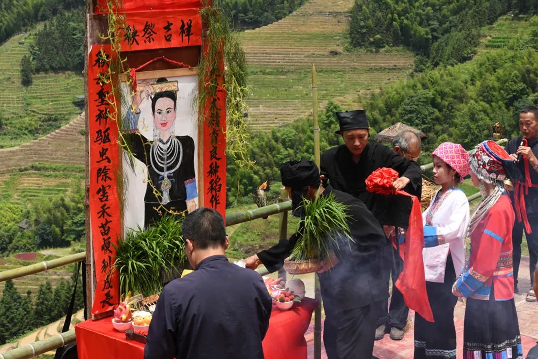 活动当天,村民们吹着唢呐,敲着锣鼓,舞起雄狮,姑娘和嫂子们手捧酒杯唱着欢快的敬酒歌,向远道而来的客人敬上一杯香甜的龙脊水酒。随后,平安壮寨村民们聚集在梯田“秧母田”田边,在寨佬和师公的带领下,在“秧母田”田边烧香,祭祀“秧母娘娘”。师公们鸣号、起鼓、祈福,在插秧之前向“秧母娘娘”上香并用秧母神梳,梳理秧苗抛入田中。雕花的秧梳相传是秧母娘娘留在人间的神物,用它梳理过的秧苗能茁壮成长,不长害虫,祈求秧母娘娘保佑全寨风调雨顺、五谷丰登。