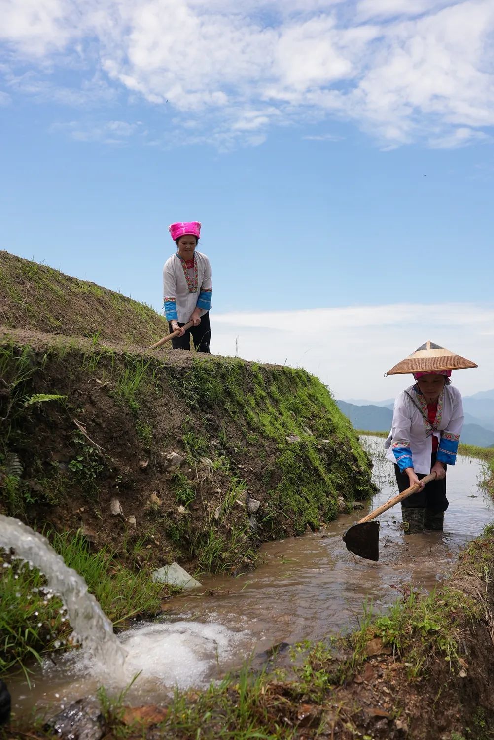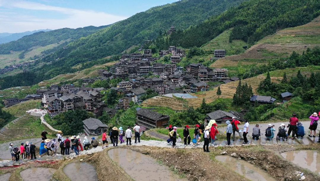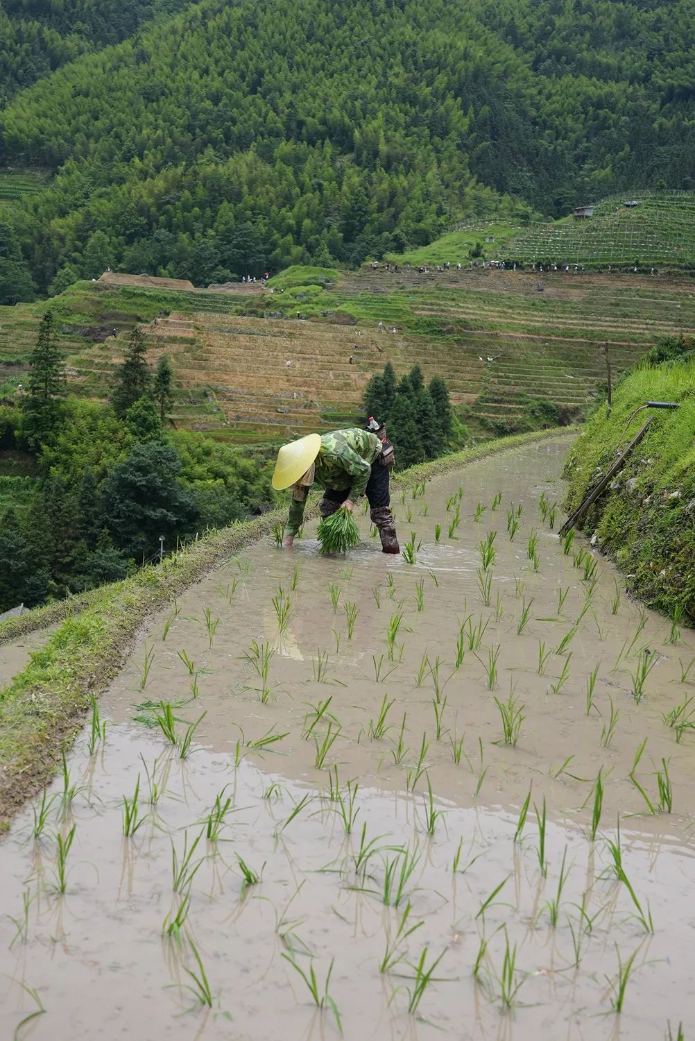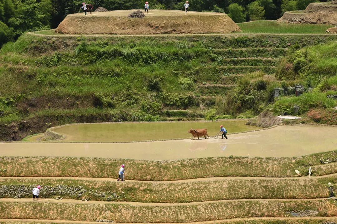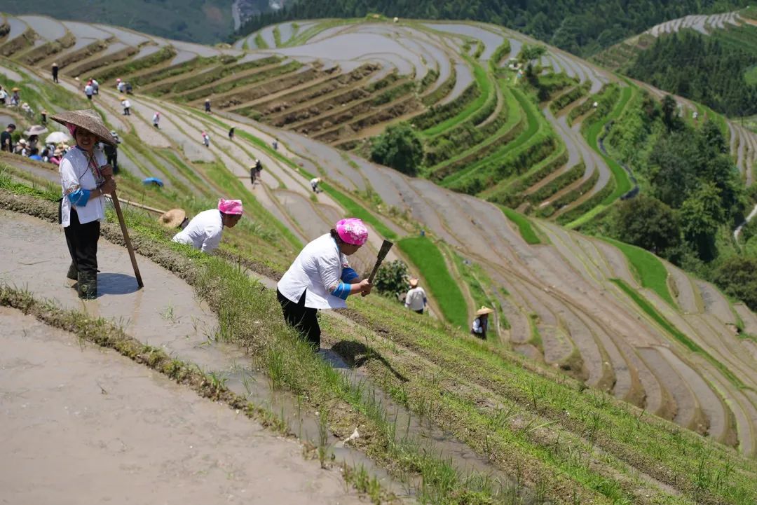 目前,龙脊梯田进入全面插秧季节,梯田水满泥润,当地农民在田间偶耕、梳秧、插田,吸引了大批游客和摄影爱好者。