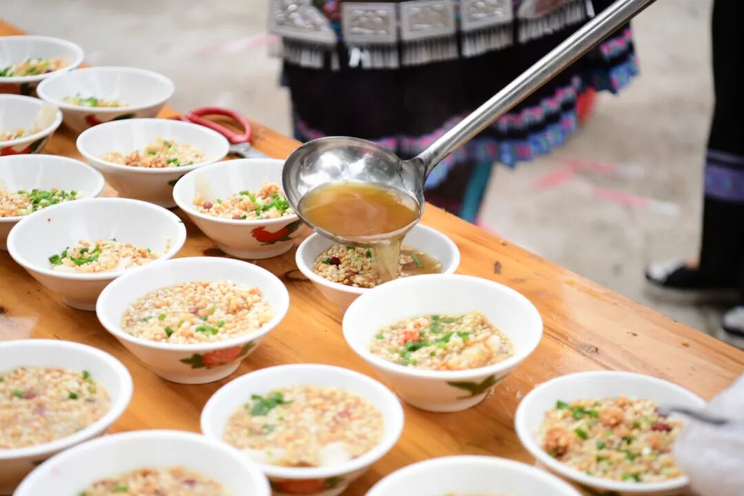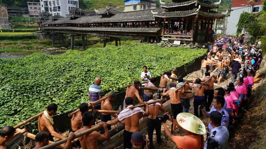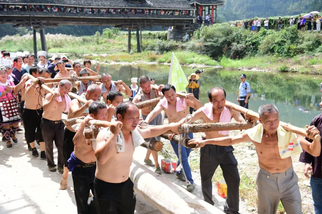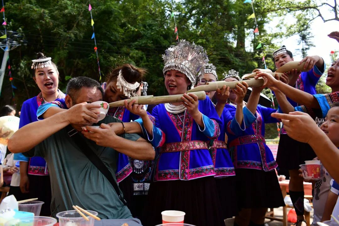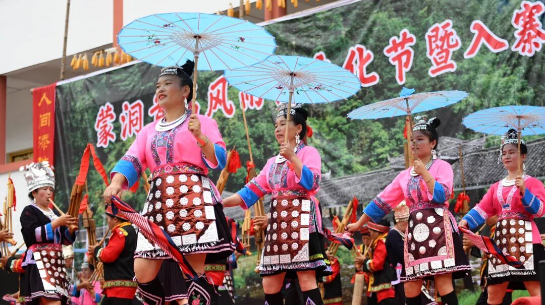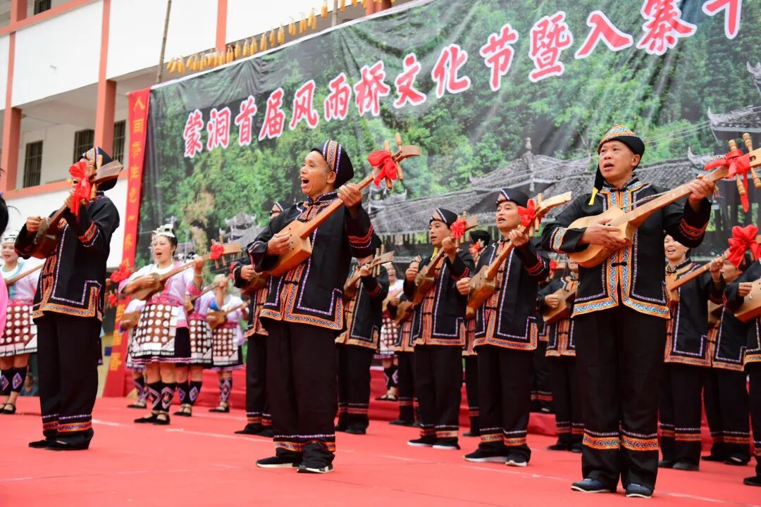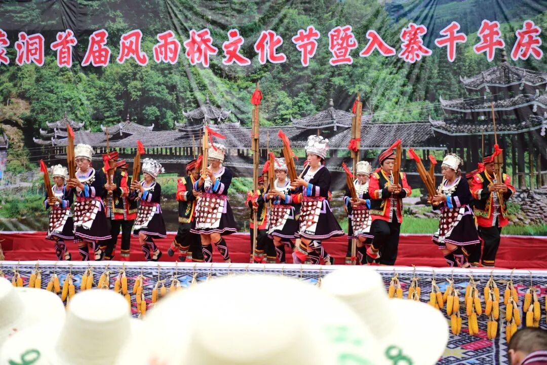 侗族称风雨桥为 “福桥”“风桥”、“风水桥”,在侗族人眼中,风雨桥是生命之桥,所有的生命都是从风雨桥走到世间来,风雨桥是侗寨里最华丽的建筑。在蒙洞人的眼中,今天没有比参加风雨桥文化节更重要的事。一大早,阿哥阿嫂们就身着侗族服装,吹起芦笙跳起舞,歌舞悠扬伴着银饰碰撞叮当作响,在寨门口迎接贵客的到来。走进寨门,在文化楼前,侗族阿嫂们都会热情地捧上一碗油茶,赶路的疲惫一扫而光。