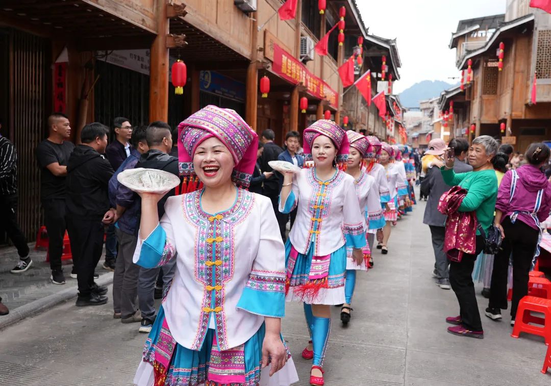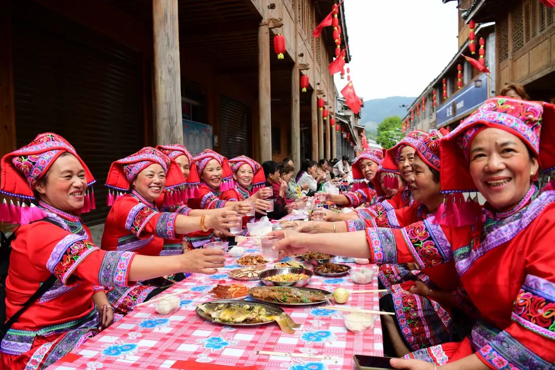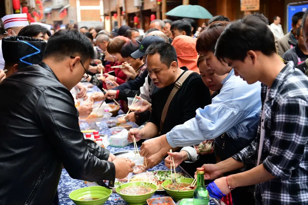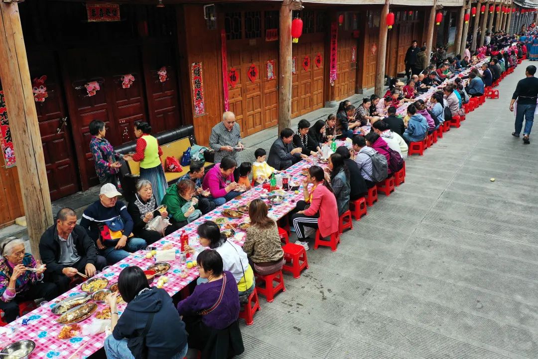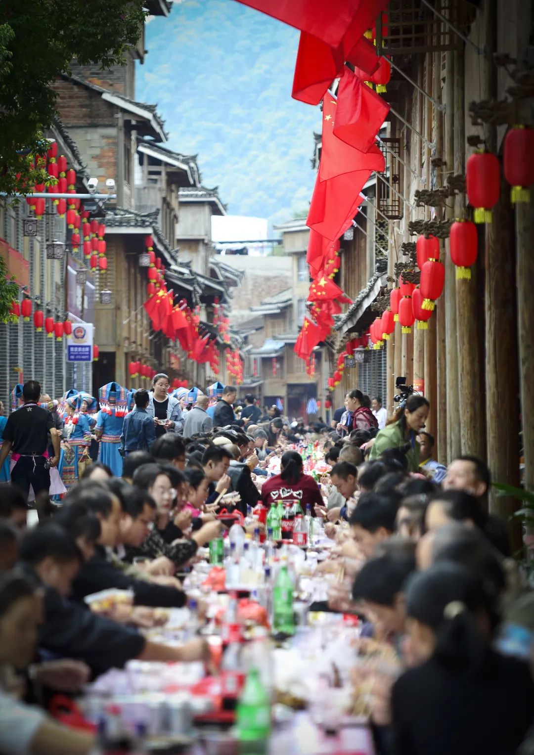 “上菜咯,上菜咯……”随着壮族阿嫂们一声声清脆嘹亮的呐喊,游客和群众纷纷落座长桌宴,独具特色的吊脚楼下,几百米长桌宴沿街而设,大家纷纷举杯欢庆这一时刻。