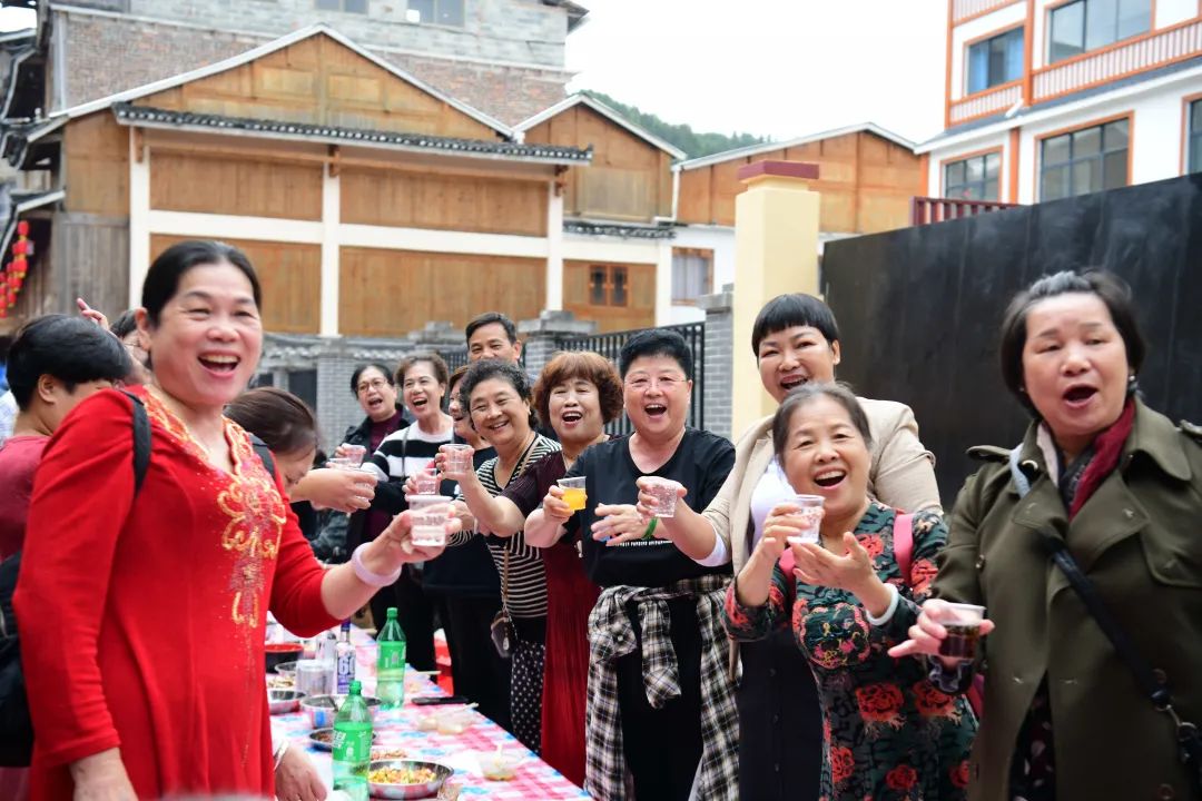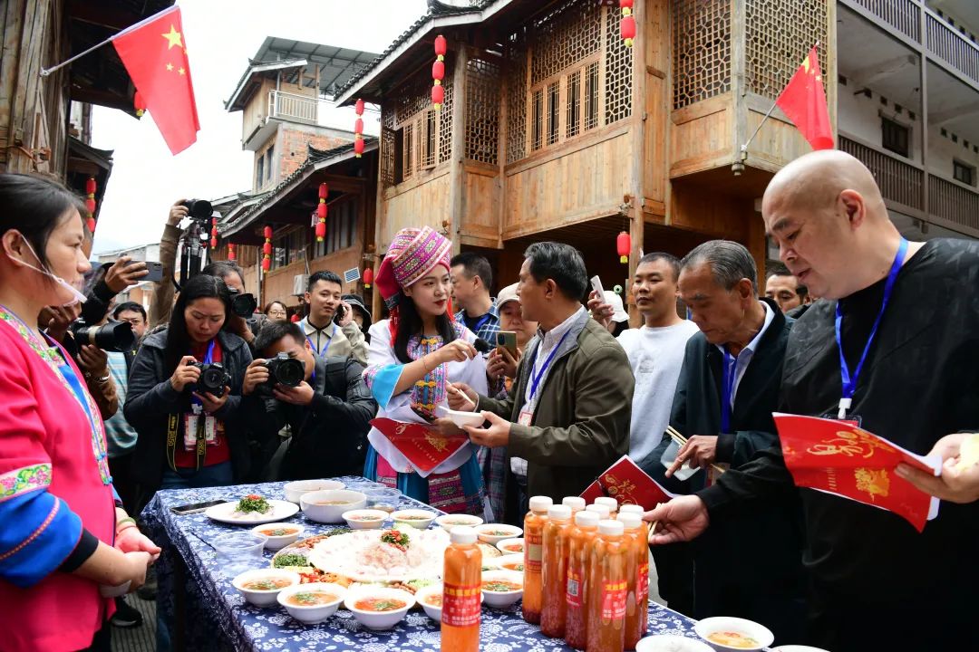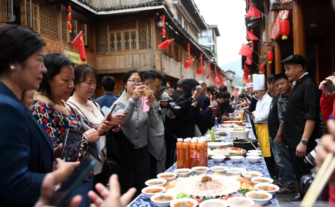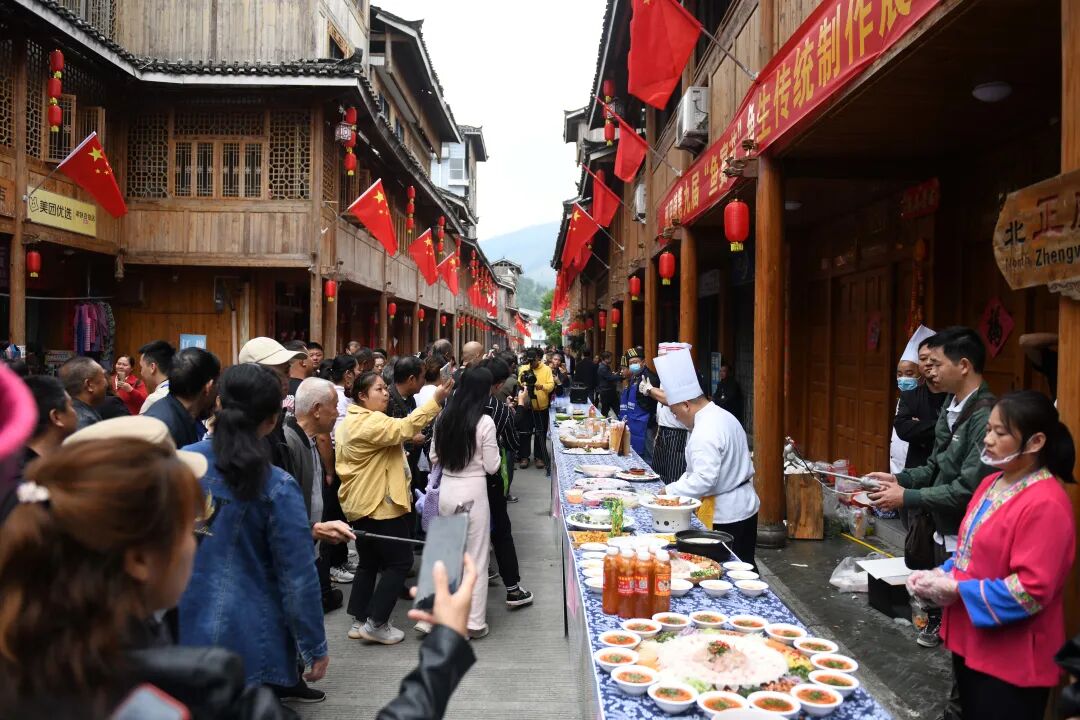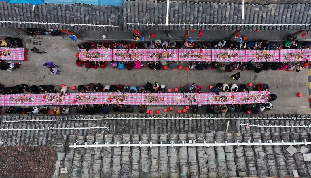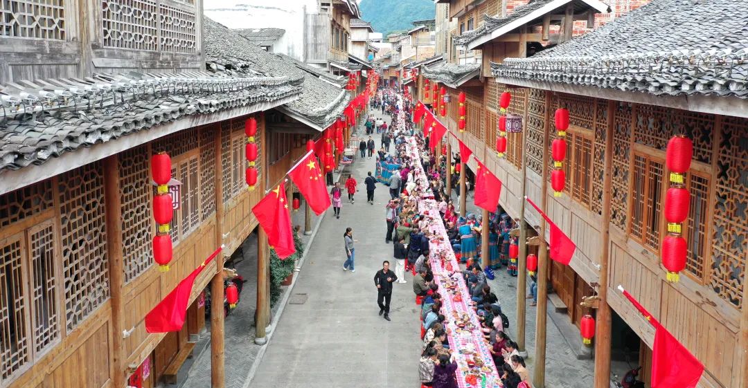 “上菜咯,上菜咯……”随着壮族阿嫂们一声声清脆嘹亮的呐喊,游客和群众纷纷落座长桌宴,独具特色的吊脚楼下,几百米长桌宴沿街而设,大家纷纷举杯欢庆这一时刻。