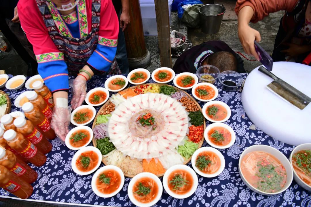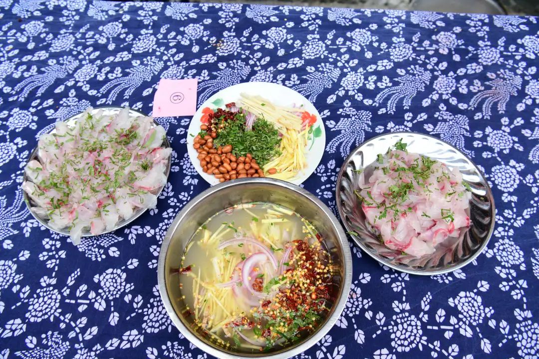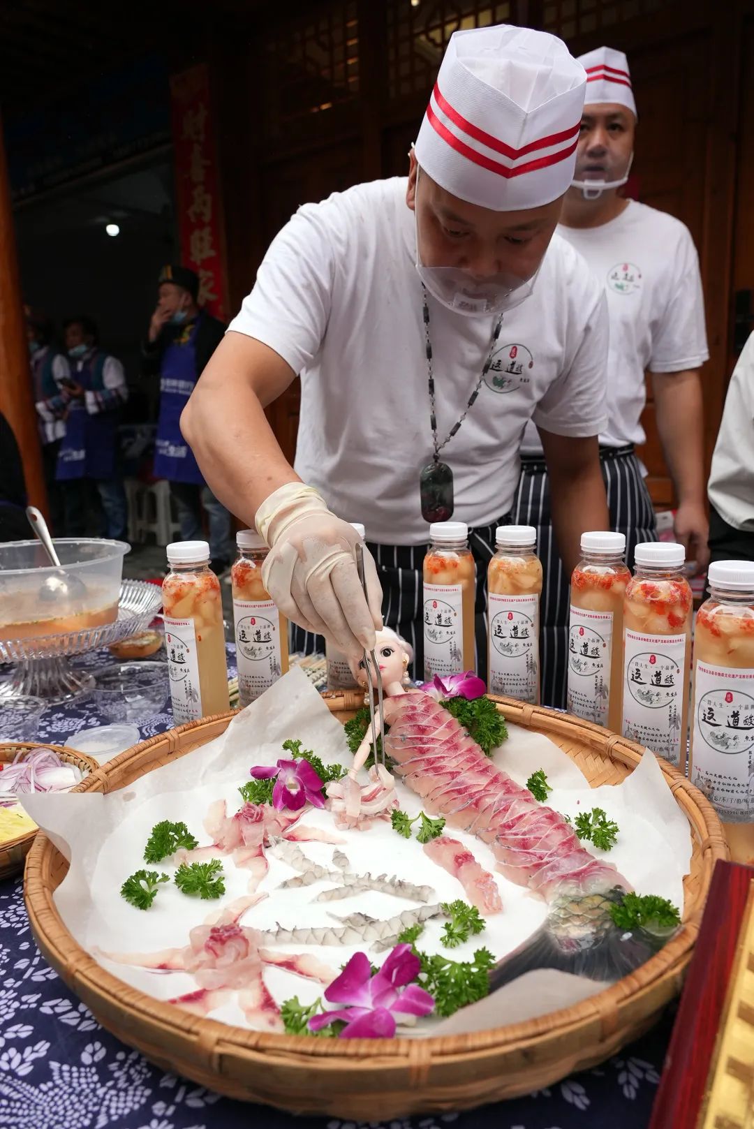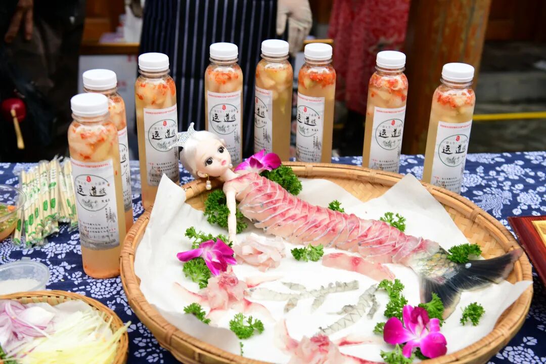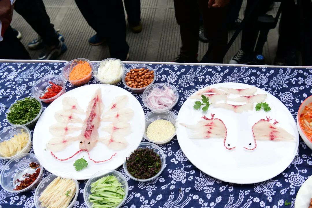 “我们的鱼生选用的是浔江里的鲤鱼、一年以上自家酿的酸水,切好后配上姜丝、生辣椒、生茶油、花生、紫苏、芝麻、洋葱、鱼香草等。”在鱼生擂台赛现场,6支参赛队伍都拿出了自己的看家本领,晶莹剔透的鱼生片造型各异,酸水、作料等整齐地摆放在一旁,色彩斑斓,仿佛一个调色盘,让人赏心悦目的同时也大饱口福。