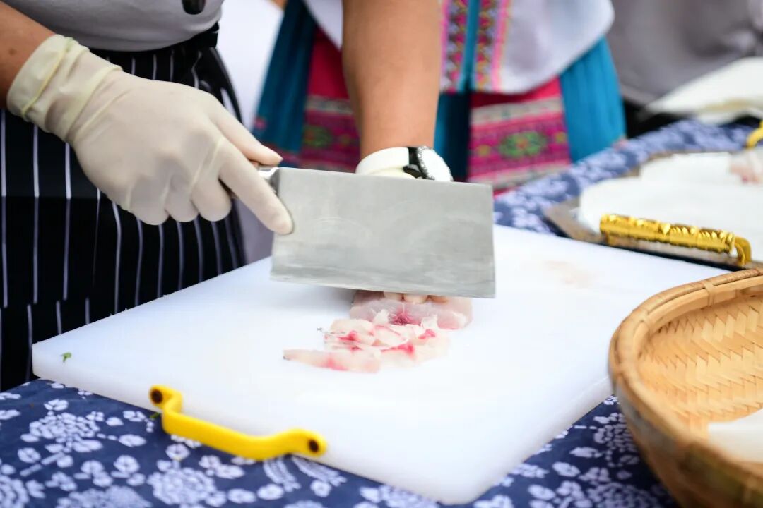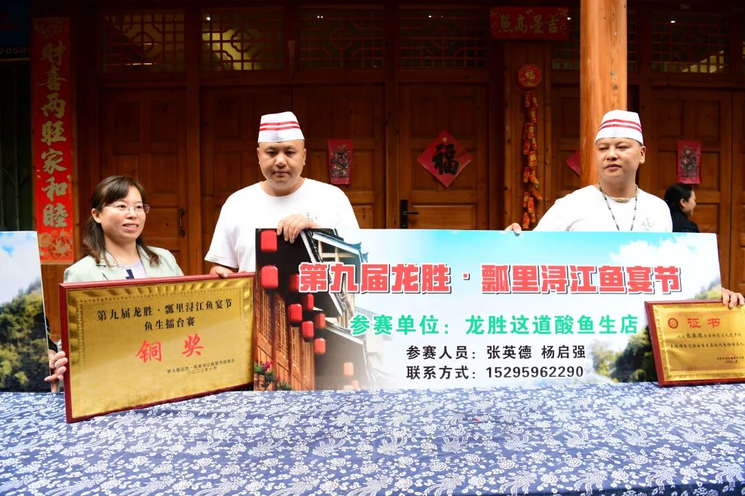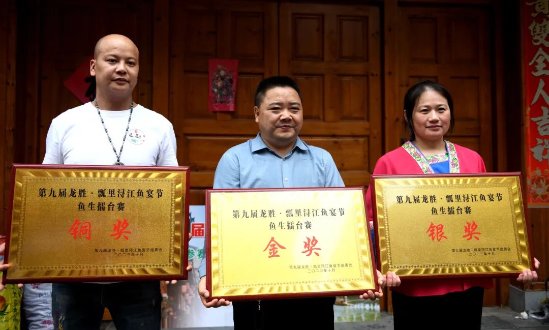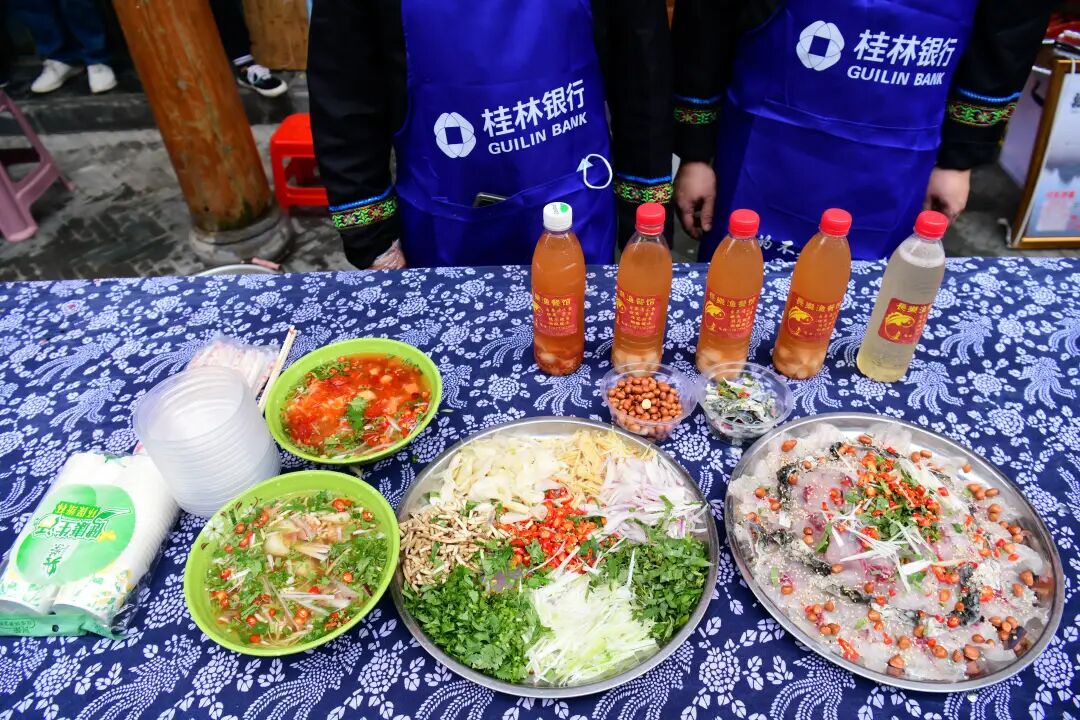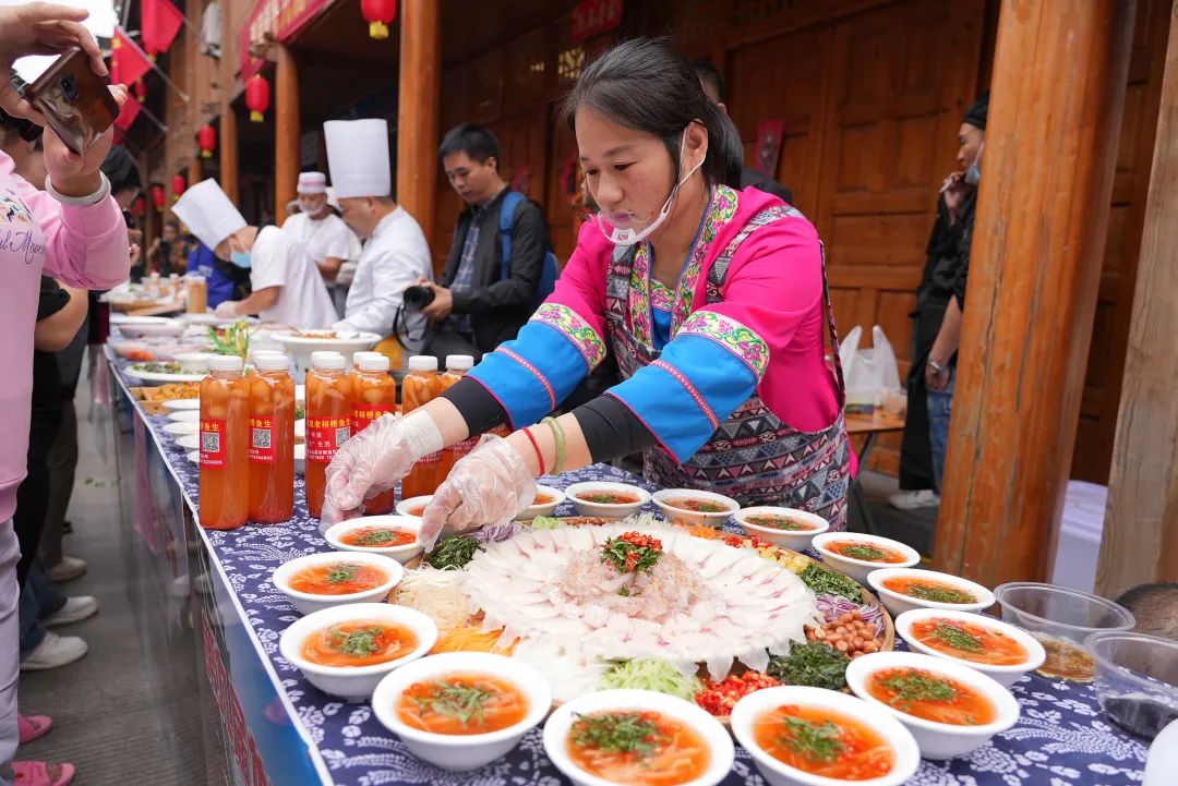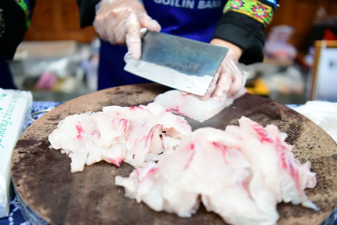 “我们的鱼生选用的是浔江里的鲤鱼、一年以上自家酿的酸水,切好后配上姜丝、生辣椒、生茶油、花生、紫苏、芝麻、洋葱、鱼香草等。”在鱼生擂台赛现场,6支参赛队伍都拿出了自己的看家本领,晶莹剔透的鱼生片造型各异,酸水、作料等整齐地摆放在一旁,色彩斑斓,仿佛一个调色盘,让人赏心悦目的同时也大饱口福。