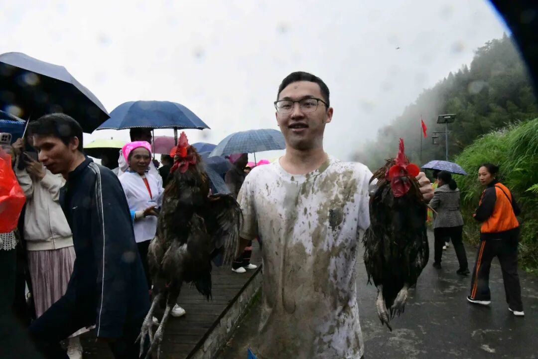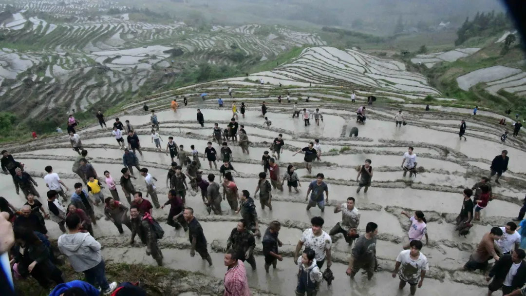 在放完水的梯田里,一只只凤鸡、翠鸭在梯田顶端被人抛出,飞向田间。这时游客和村民纷纷挽起裤脚下田抢凤鸡、翠鸭,谁捉得到就归谁,抢到的满心欢喜,满身泥水也在所不惜。