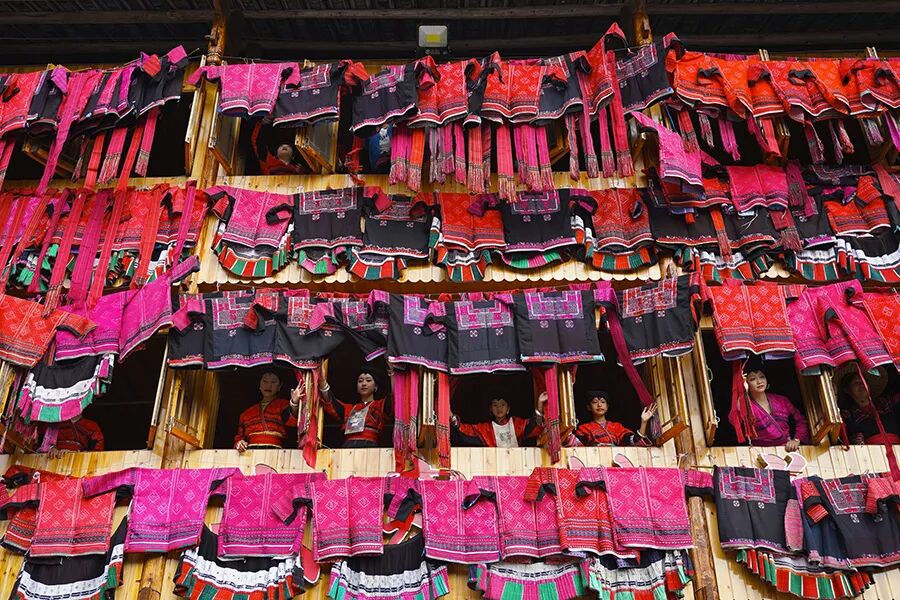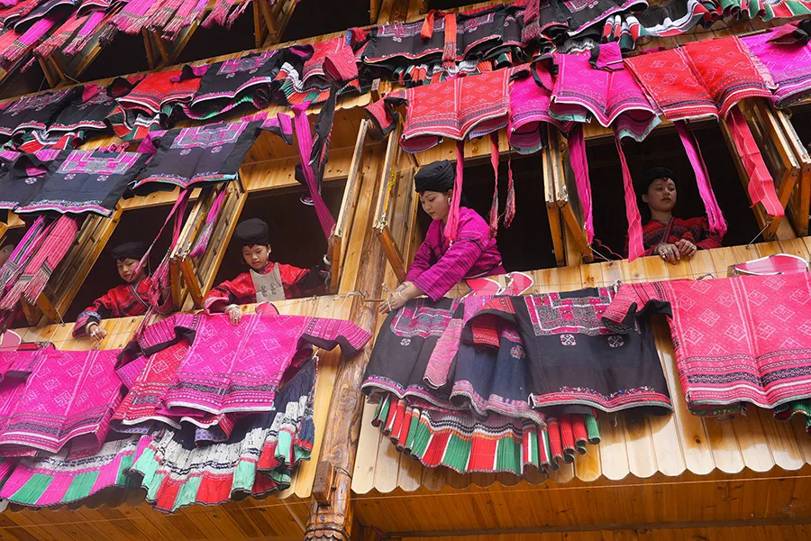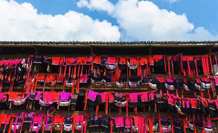 每家每户都把箱底的花衣、饰衣、花裙拿出来晒,各家的晒排上、走廊上一串串红红绿绿的衣裳鲜艳夺目。30位红瑶少女8:00至8:30在村委集体展示晒红衣。