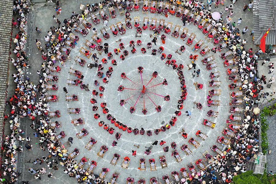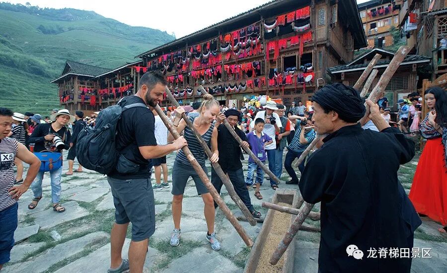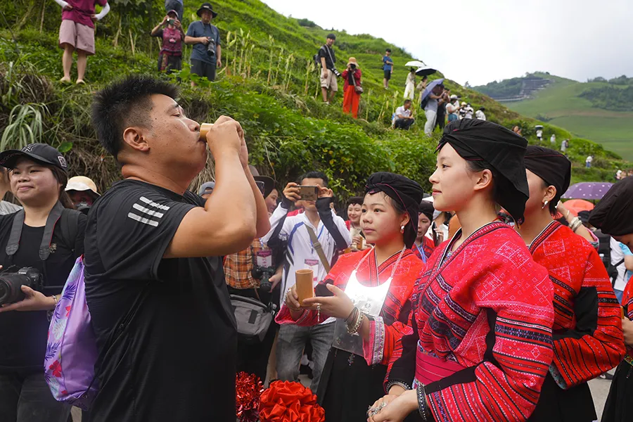 村寨里的姑娘和嫂子们手捧酒杯唱着欢快的敬酒歌,向远道而来的各位贵客敬上一杯香甜的龙脊水酒。