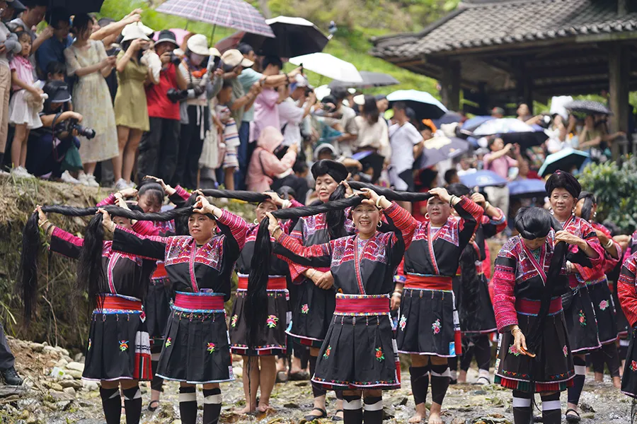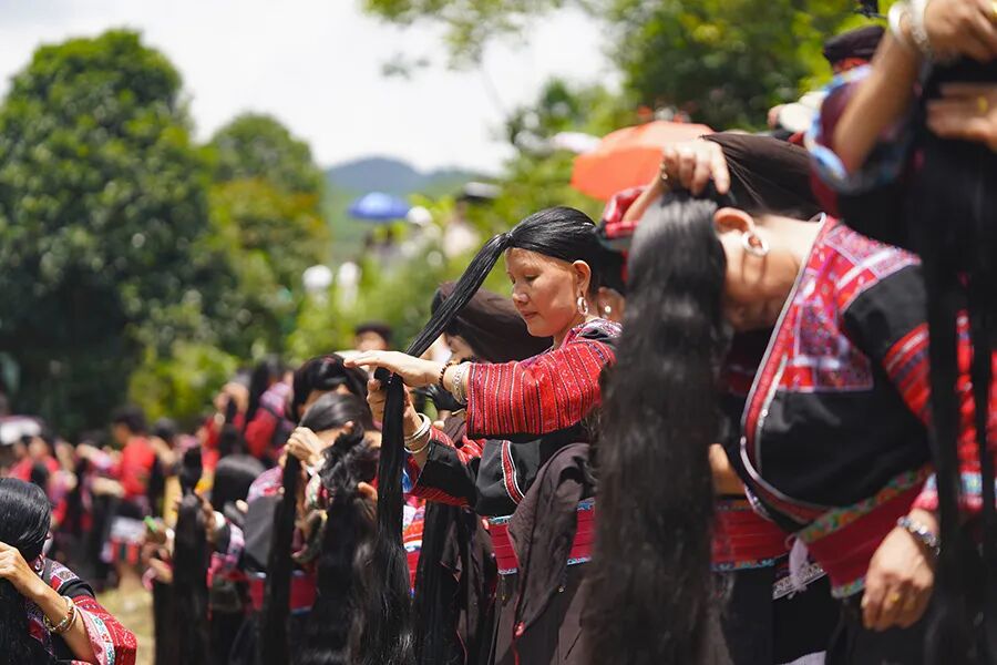 红瑶妇女有从小开始留长发的习俗,世代相传。红瑶有"三怪":“头发当草帽戴、手镯当耳环戴、衣服全是丝线带”。这三怪就是红瑶本民族标志性的特征。长发在红瑶象征着长命富贵。当天,村寨中的红瑶女身着艳丽的红瑶服饰,不约而同的来到河边上梳理自己的长发,把自己最美的一面展现出来。