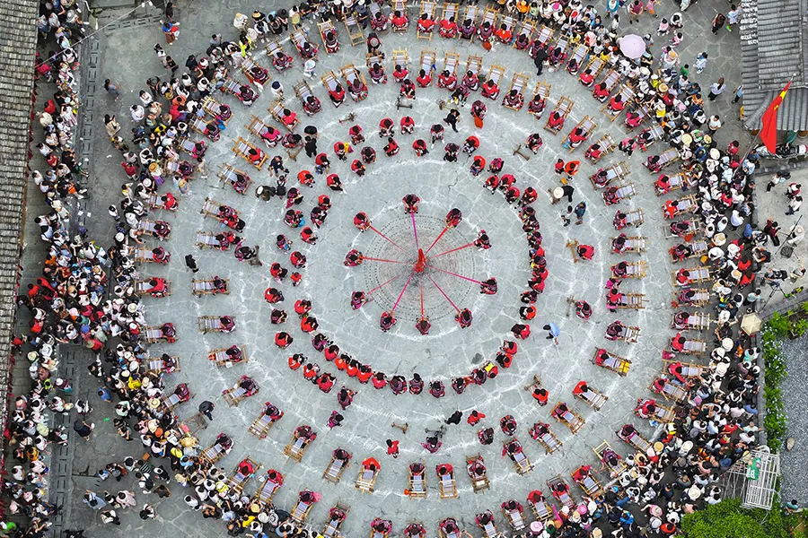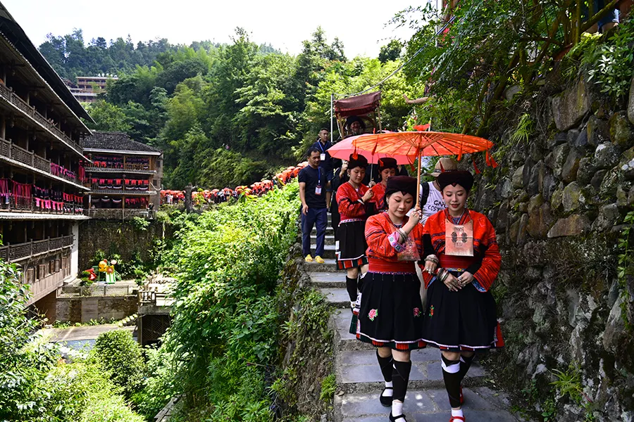 晒衣节当天本寨一对新人,按红瑶的传统婚礼习俗,举行盛大的集体婚礼,红衣定终身。