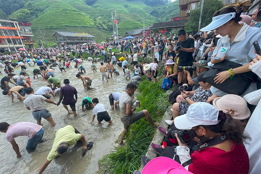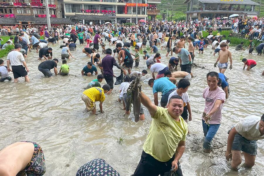 一群红瑶村民穿着蓑衣戴着斗笠围在河边敲锣打鼓,田中的鱼偷偷的探出脑袋,村民与游客纷纷挽起裤脚光着脚丫子下河摸鱼,全寨欢庆。
