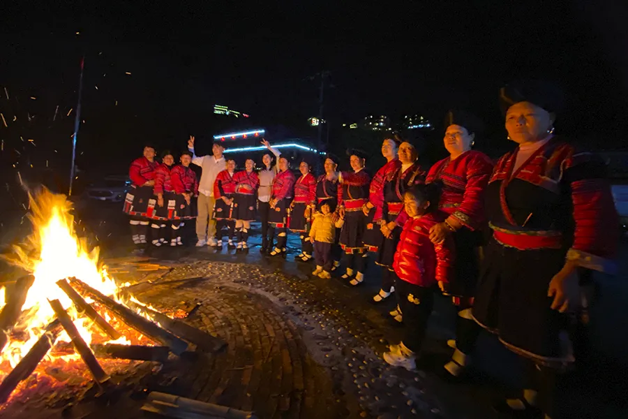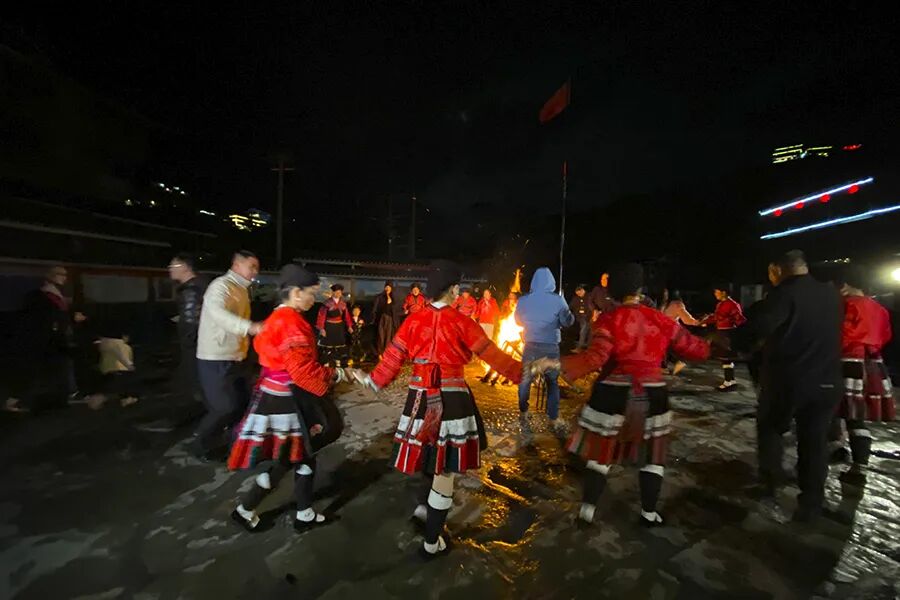 热情好客的村民身着盛装,将火把围成一堆的篝火,全村的村民与新人的亲朋好友跳起“大团圆舞”舞,人们沉浸在歌舞的海洋中,尽情欢歌起舞,共度良宵。
