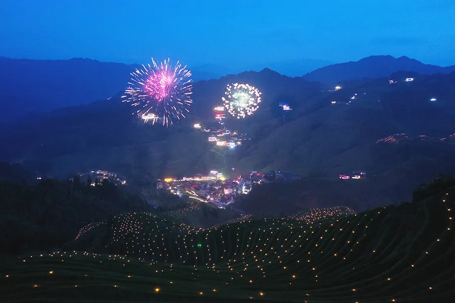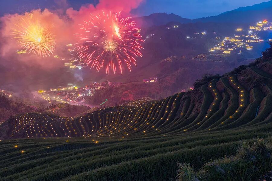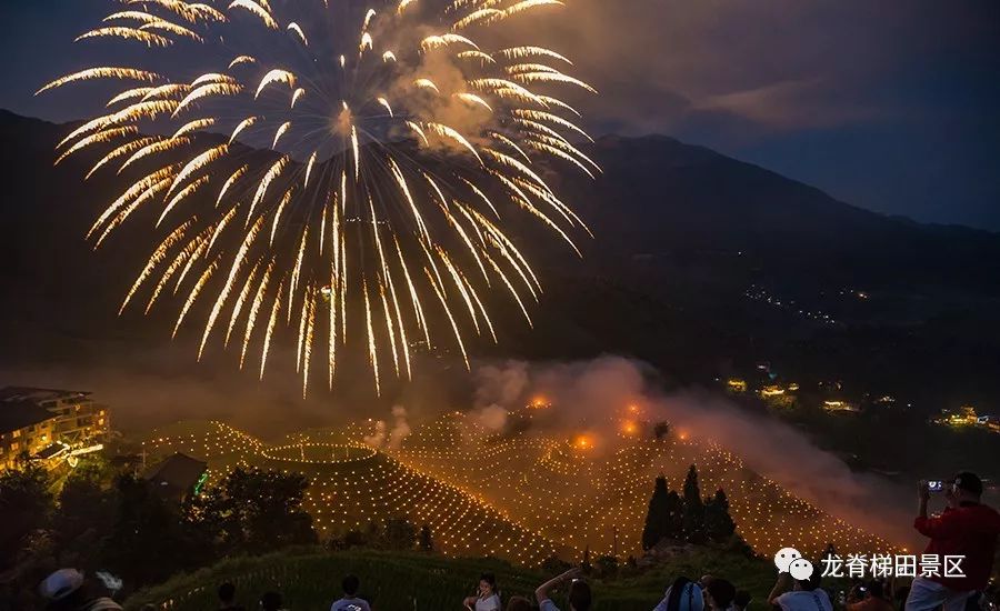 夜色渐暗梯田上的火把逐渐汇集起来,构成一幅美丽画面,绚丽多彩。梯田上空放起了烟花,刹时,烈焰腾空,响彻云霄,场面壮观。