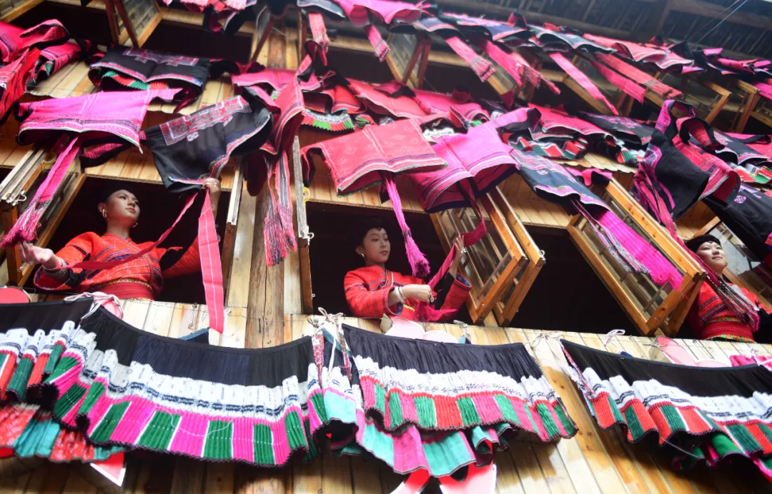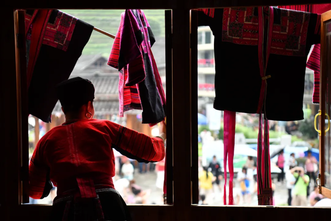 当天清晨,当第一缕阳光穿透薄雾,整个瑶寨便汇入一片红色的暖流。村寨各处,木楼栏杆、晒台之上,红瑶妇女们精心取出珍藏的嫁衣与节日盛装,一件件铺展晾晒。那些凝聚着母亲与祖母心血的土布红衣,在阳光下宛如燃烧的火焰,映衬着青翠梯田,成为天地间最壮丽的画卷。