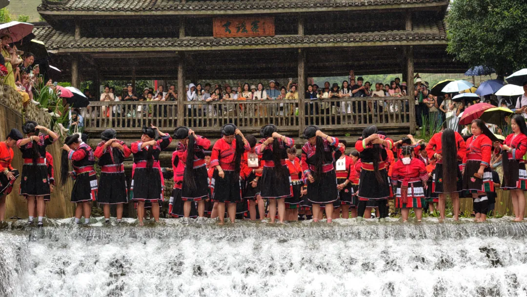 “一梳长发黑又亮 梳妆打扮为情郎 二梳长发浓有亮 夫妻恩爱情义长 丝丝长发长又亮 父母恩情永不忘 ......”。伴随着柔情的《长发谣》响起,来自大寨村、黄洛瑶寨、小寨村等红瑶村寨的上百名瑶族妇女在小溪旁展开集体长发梳妆,展示龙胜独特的长发魅力。