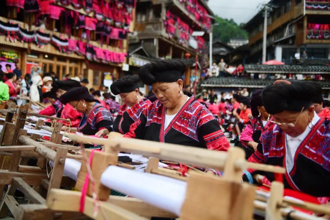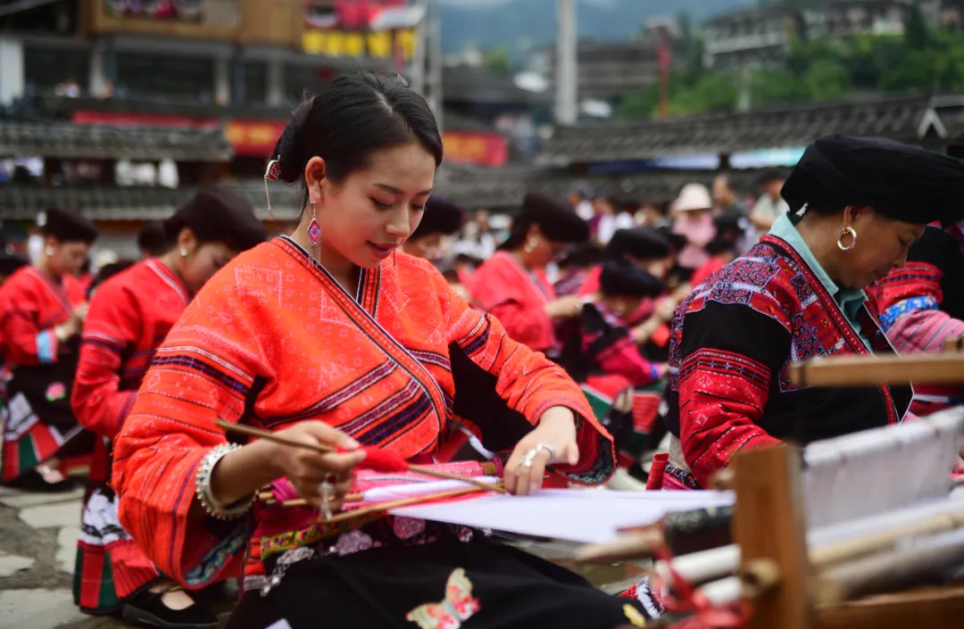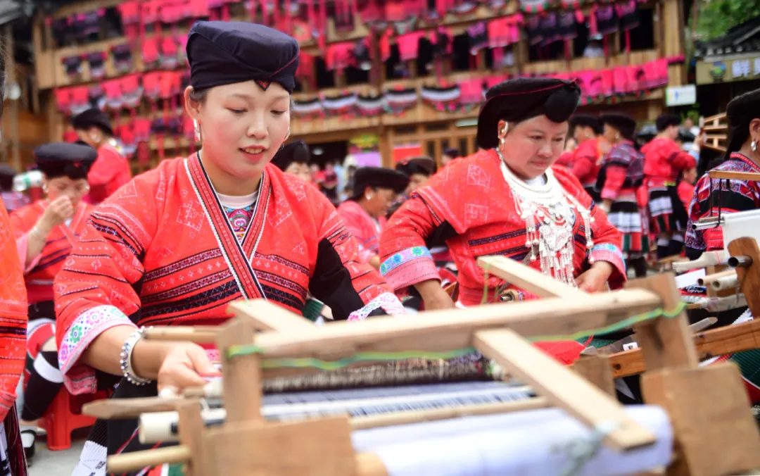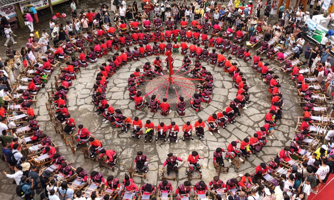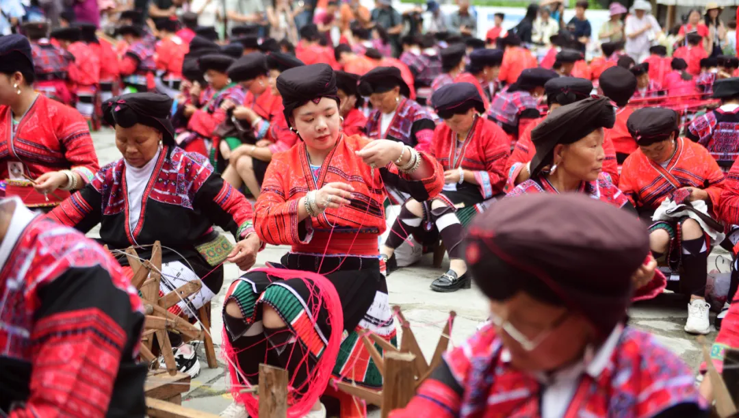 红瑶服饰因制作精美,色泽鲜艳而闻名,2014年被列入国家非物质文化遗产(瑶族服饰)保护名录,是龙胜当地引以为豪的民族瑰宝。当天下午,在非遗展示中,瑶嫂们现场演示着“织、绣、镶、拼”等“飞针走线”的精彩绝活,让在场的中外游客大饱眼福。土布在古老织机上穿梭,针线游走间,花鸟虫鱼、历史故事跃然布上,一针一线皆是对祖先智慧与审美的生动传承。