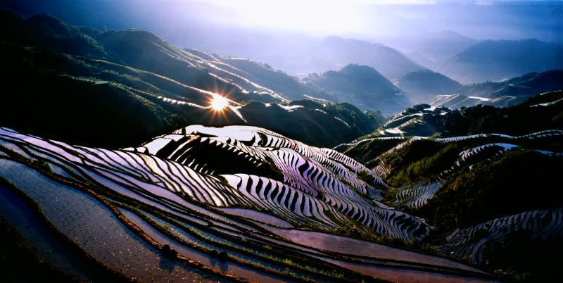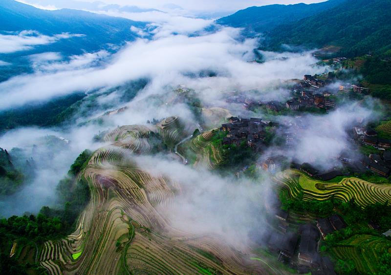 春季3月龙脊油梯田菜花盛开,一派生机勃勃;5月中下旬,放水后的梯田在阳光下如明镜般反射光芒,美丽耀眼。