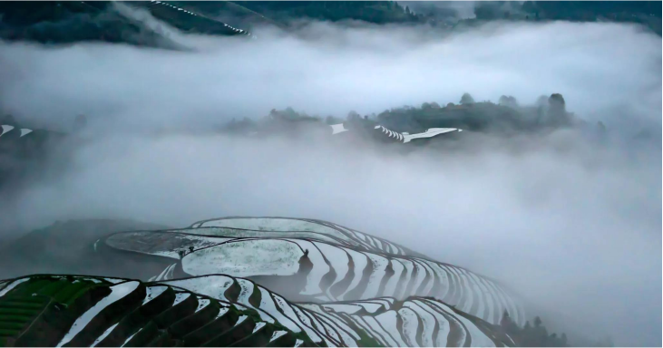 在冬天里也能看到镜面梯田。