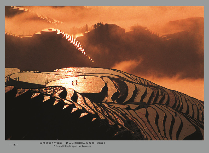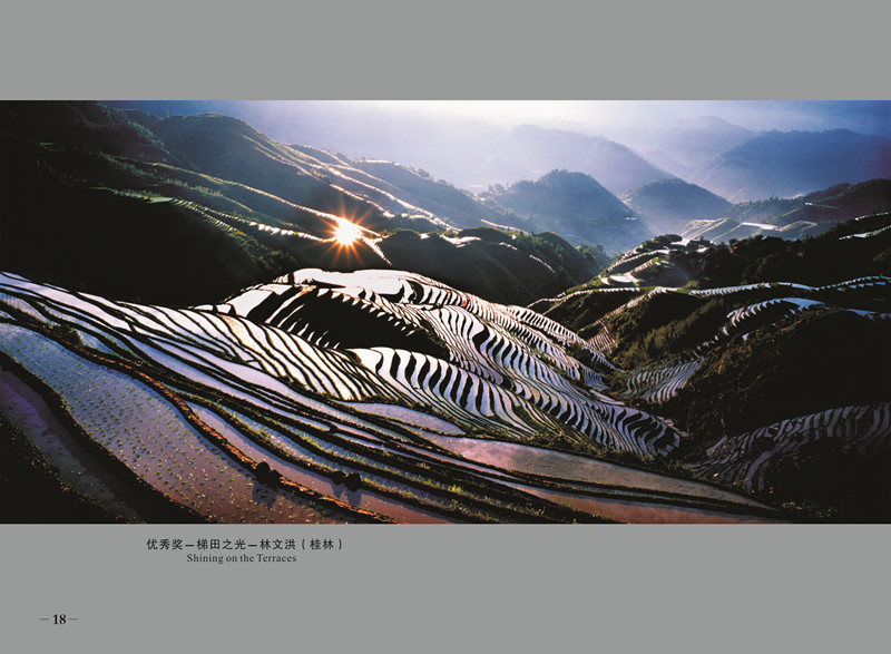 梯田如链似带,把一座座山峰环绕成一只只巨大的螺蛳,有的像巨扇一样半折半开,斜叠成一个个狭长的扇;有的则像天镜被分割,然后有层次地镶嵌成多种图形的碎块,在这个广袤的方围内,小路悠悠地,蜿蜒在跌宕有致的梯田里,飘忽成一根根细绳,而袅袅地萦绕在它上空的龙脊壮族山歌,缥缈成一缕缕云烟;那一幢幢被水光映照,被云影拂弄的壮族“麻烂”,则被空灵成仙宫了。