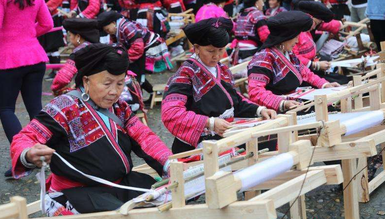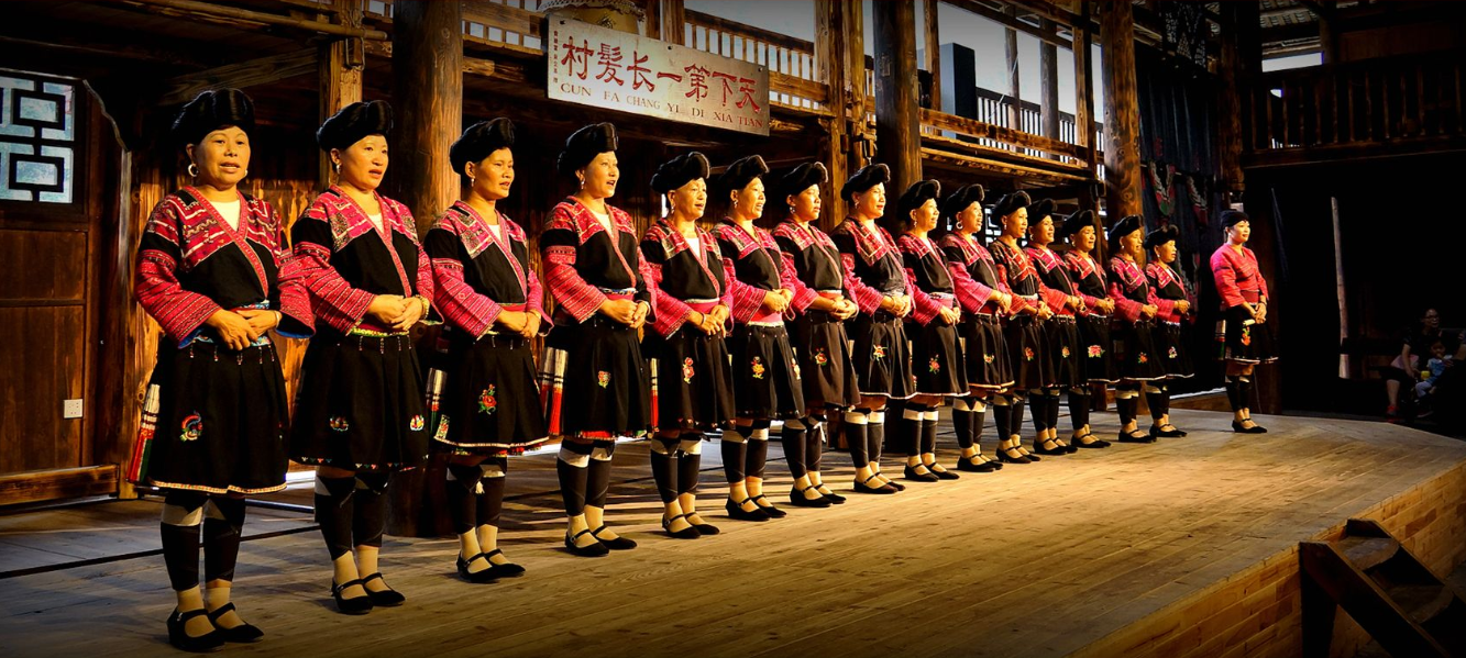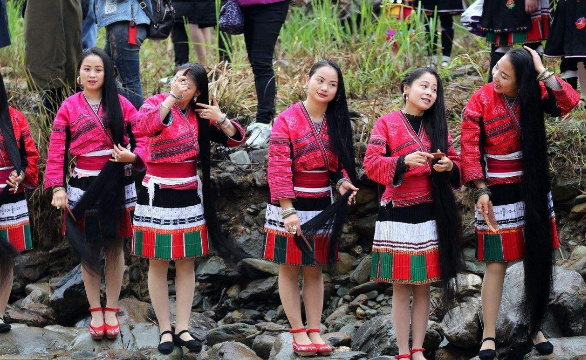 歌舞表演瑶族的年轻女子,一般都穿着鲜艳的纯红色衣服,配着黑色的裙子,下面是一双老式的布鞋。而结了婚的妇女,就介于未婚女子与老年妇女之间,她们的衣服是黑中夹杂着红色的。老年妇女,自然就是纯黑的衣服,只剩下一条红色的腰带了。而无一例外的,就是每一个瑶族妇女,无论年龄大小,无论结婚与否,都是带着大大的银耳环的。这些少数民族女子,心灵手巧,个个面街摆上自己亲手做出来的手工艺品,靠这些换取自己的相当一部分生活收入。这些瑶族女子,将头发视作自己生命的一部分,所以头发都很长,这个村子就叫长发村。而这些女子,一生都有着固定的发型。不论年龄大小,一律都要将头发在头上盘起来。对她们来说,头发就如自己的身体,是不能轻易剪的,所以未婚女子在十八岁的时候才能将头发剪了,代表自己已成人。