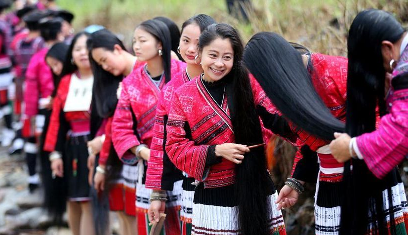 在红瑶女的心中,长发有着非常重要的意义。长发,有着“长长久久,兴旺发达”的寓意,象征着长命和富贵,象征着繁盛和吉祥。红瑶女对于头发极为珍视,有世代相传的蓄发、梳妆发型的习俗和护发秘方。她们从十二三岁开始蓄发,长到一定长度后可以剪下长发珍藏起来。红瑶女不仅头发长,而且乌黑亮丽很难见到白发。这其中是有秘方的,她们用木梳梳头,梳时小心翼翼,洗发水是淘米水和山上的草药配制而成的。