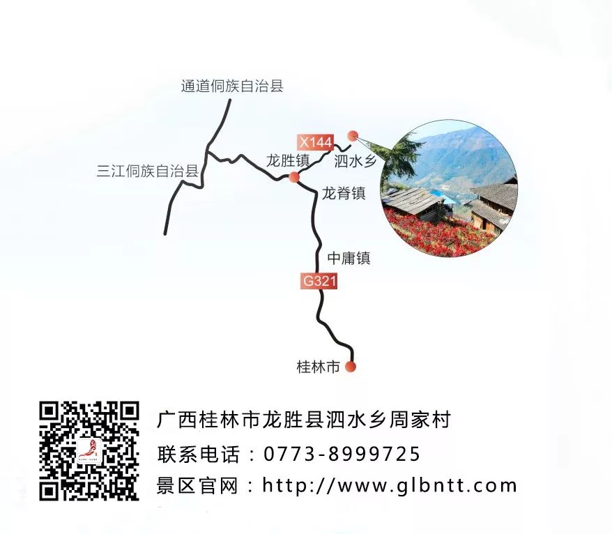 G76桂三高速段,行驶至龙胜路口下,转321国道至龙胜县城,后往北走144县道(往温泉方向行驶26公里)至泗水乡周家村即到达景区。