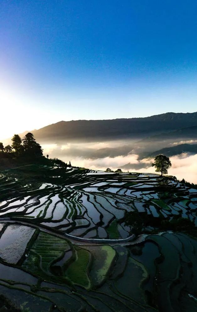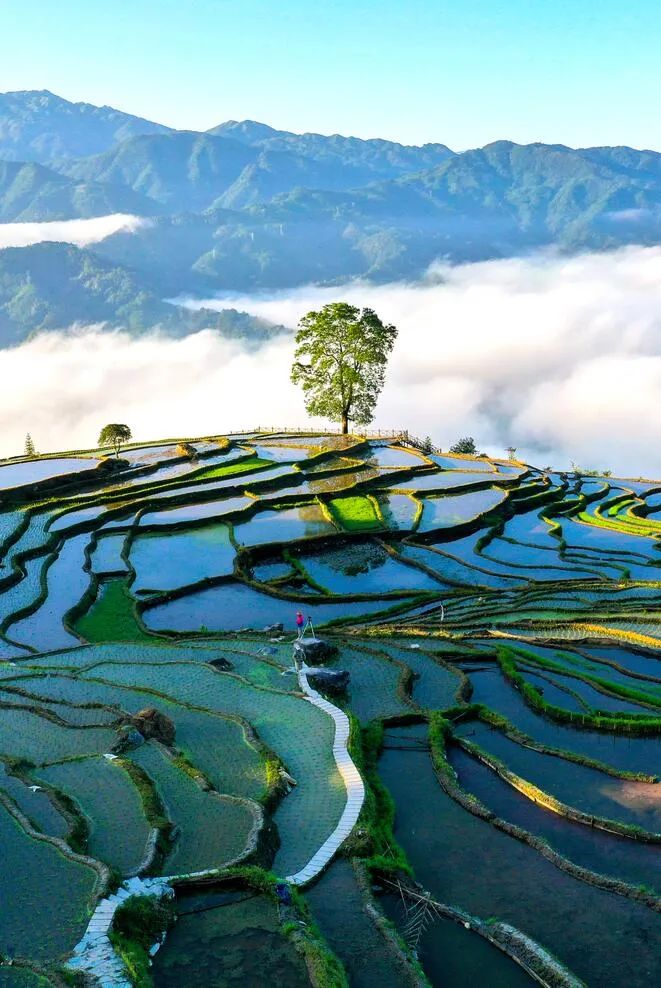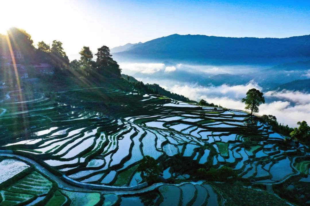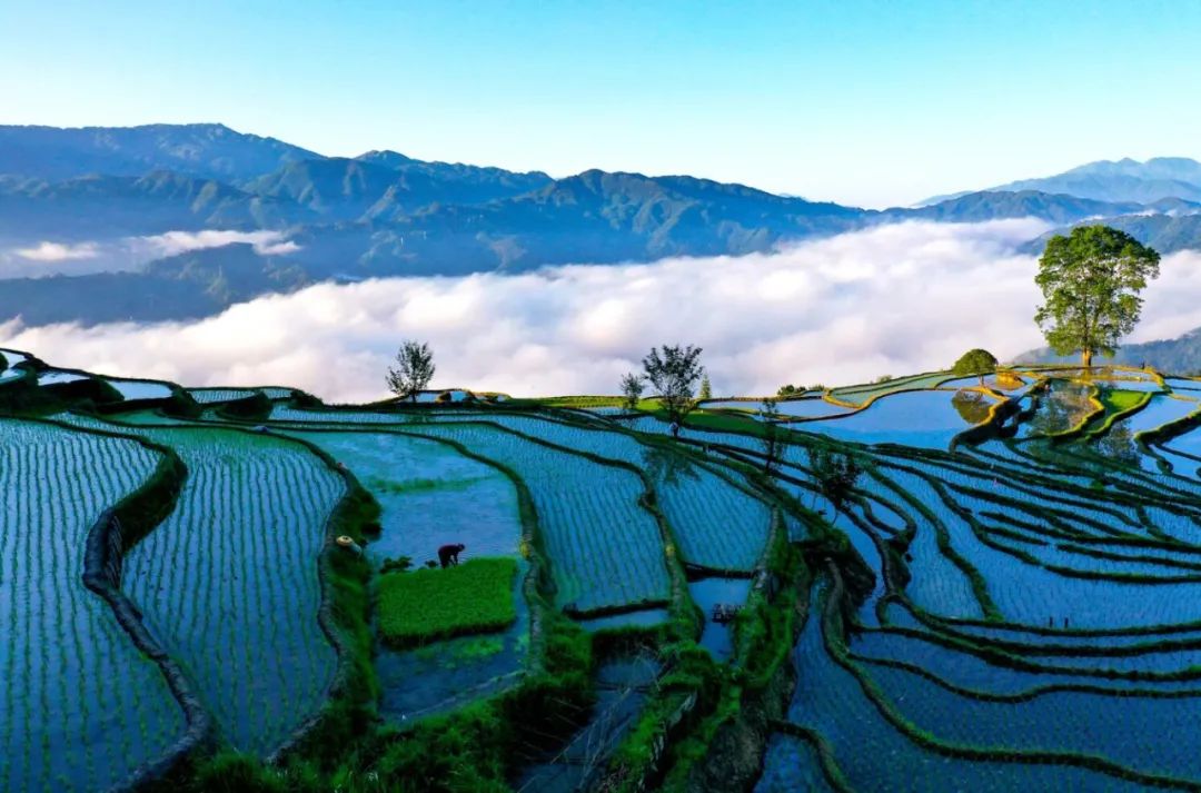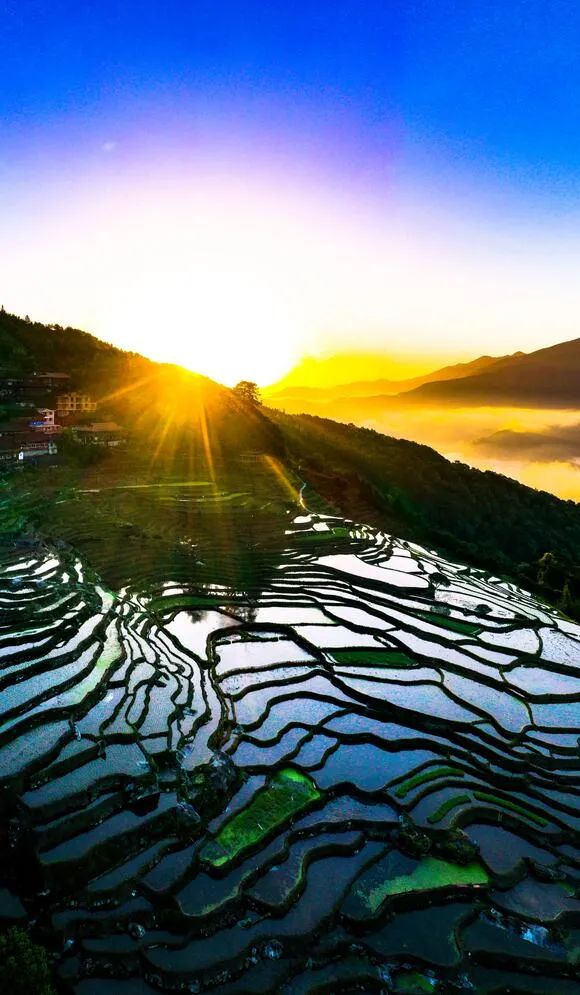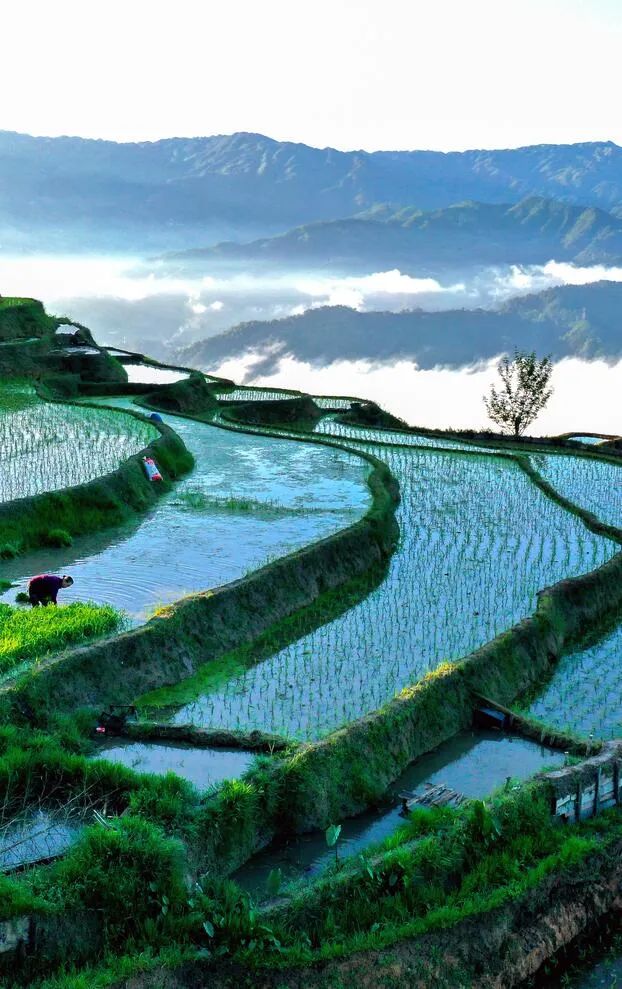 芒种时节,龙胜各族自治县泗水乡小岩底梯田水满田畴,迎来了景色唯美的季节。清晨,放眼望去,在阳光的照耀下,层层叠叠的梯田闪闪发光,犹如一块块明亮的镜子。当地村民在田间劳作,仿佛在画中耕耘。弯弯曲曲的田埂和村民们忙碌劳作的身影,构成了一幅幅美丽的夏日田园画卷,如诗如画。