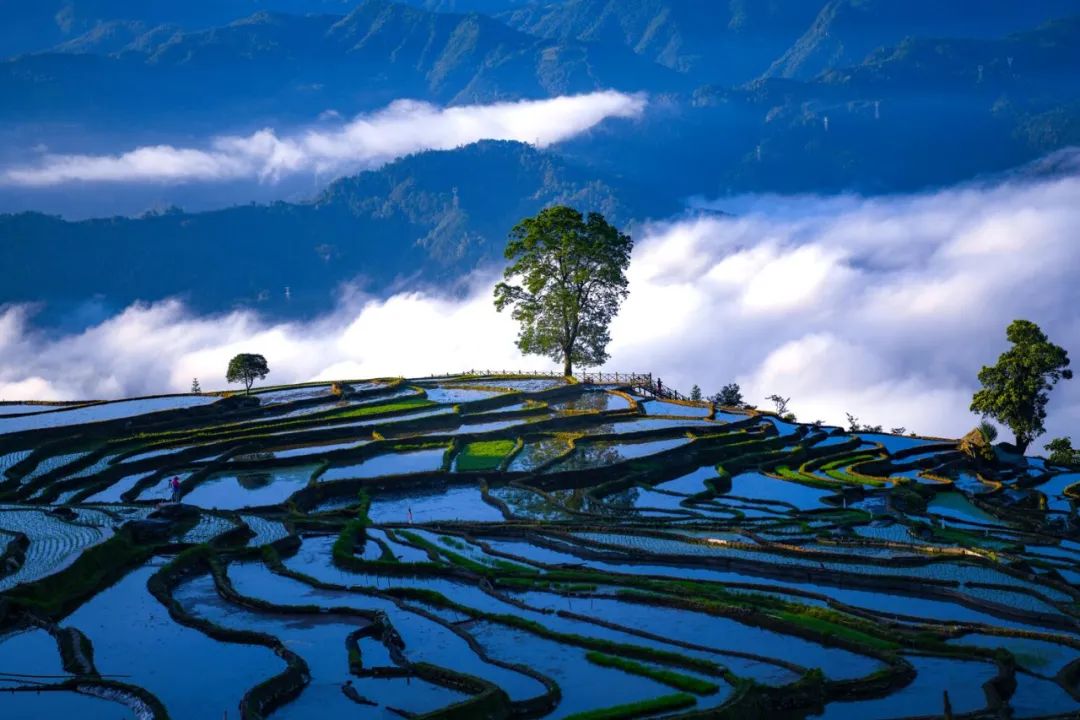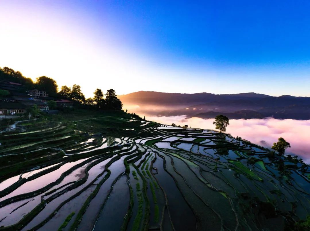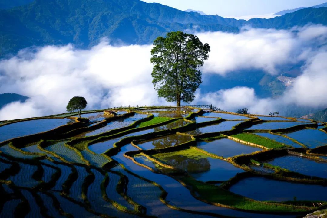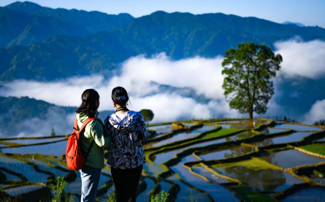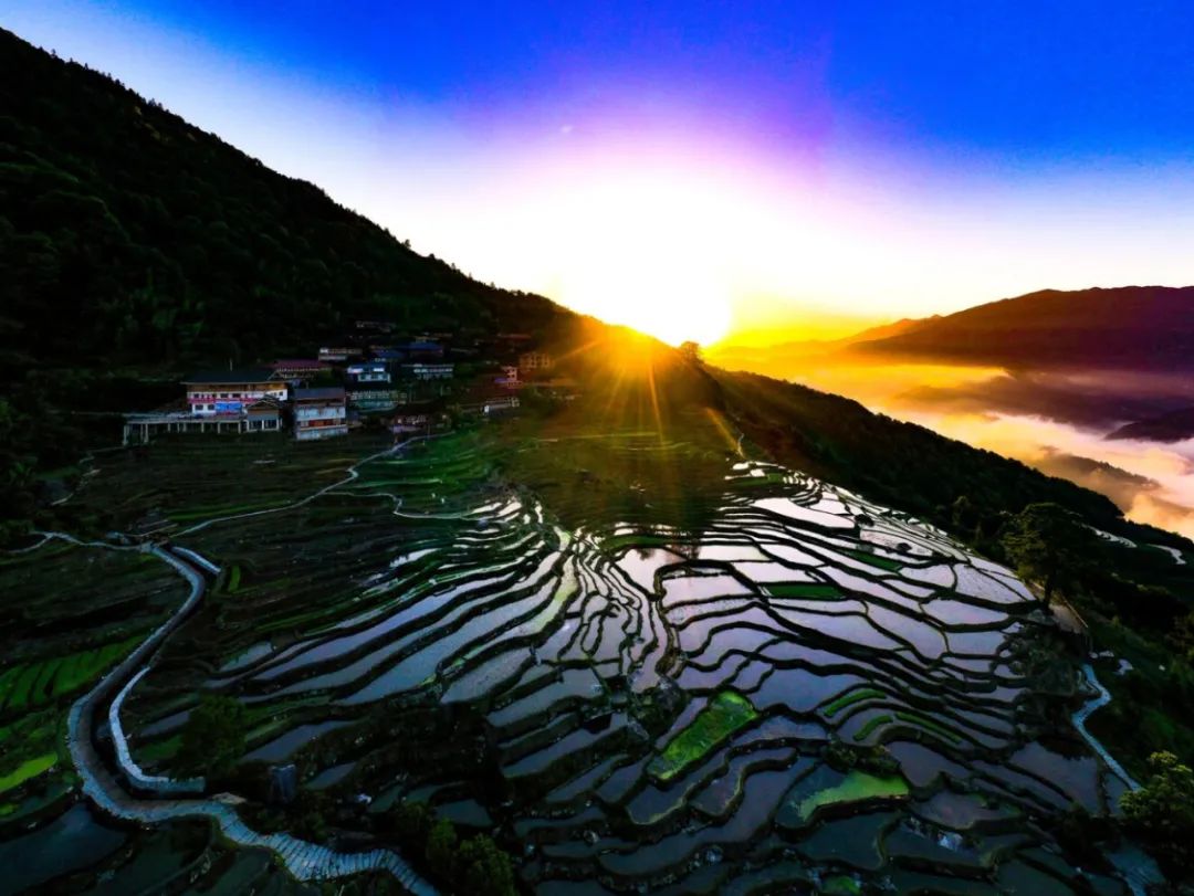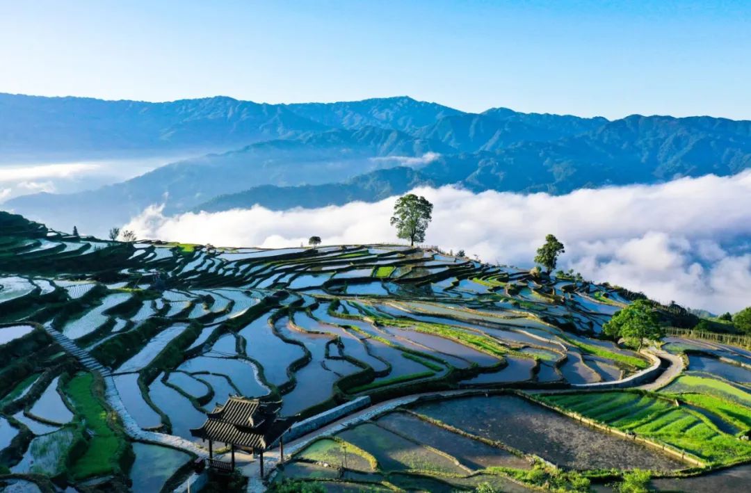 芒种时节,龙胜各族自治县泗水乡小岩底梯田水满田畴,迎来了景色唯美的季节。清晨,放眼望去,在阳光的照耀下,层层叠叠的梯田闪闪发光,犹如一块块明亮的镜子。当地村民在田间劳作,仿佛在画中耕耘。弯弯曲曲的田埂和村民们忙碌劳作的身影,构成了一幅幅美丽的夏日田园画卷,如诗如画。