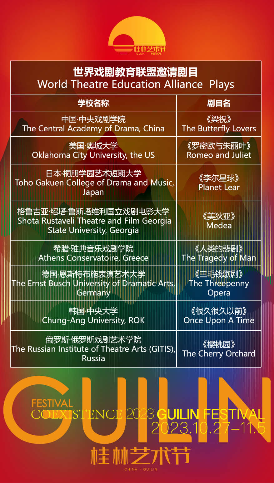 WTEA是设立在国内、以全球为视野集合多个国家青年艺术创作人才的联盟,2023桂林艺术节将是它走出校门的“首秀”。来自各国的青年艺术家,走出传统的镜框式舞台,走进桂林的山水与城市,以年轻无畏、勇于探索的姿态,实践他们对戏剧艺术的热爱与梦想。