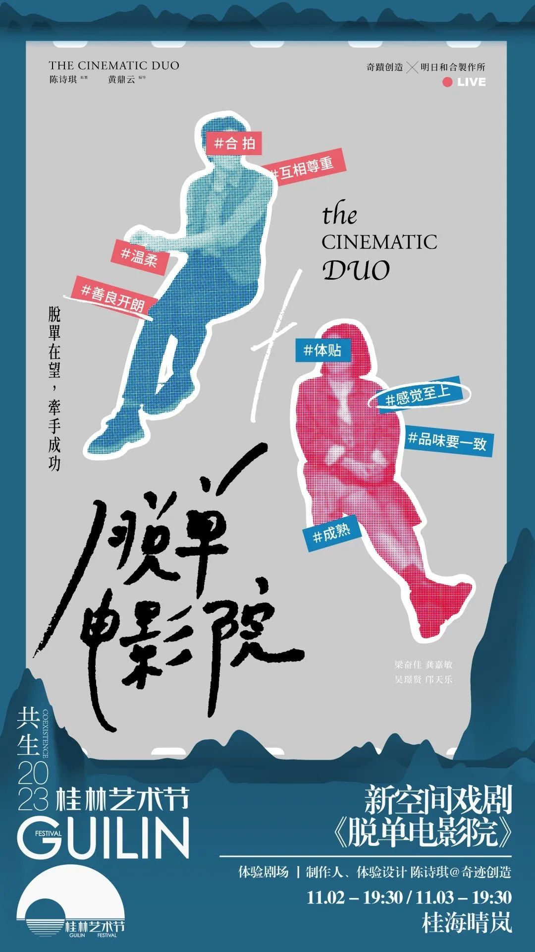 《脱单电影院》是一场以真实场景、人物互动为核心,启动观演者体验的实验。由澳门艺术团出品,有从业经历近20年的澳门制作人、策展人陈诗琪监制,理念前卫学贯中西的黄鼎云任概念编导,该作品首演曾获澳门城市艺穗节青睐,主创团队携其与桂林碰撞花火。用一出电影的时间,演绎交友、恋爱过程的形形色色,为观众创造电影桥段般的浪漫约会,每个在场的人都是演出构成的一部分,你将亲身出演爱情故事、体验约会情节!