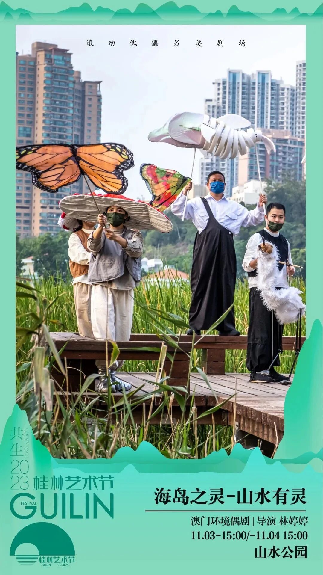 本剧将在本次艺术节特色打造的“树·剧场”展演,以桂林山水公园天然的环境作为舞台场地。蝴蝶、蘑菇、海豚、鸟雀等偶物在真实的树林间穿梭出没,栩栩如生、生机勃勃,桂林山水为作品提供广域的空间、灵气的注入。这是一次传达万物有灵的寓教于乐互动,老少皆宜、阖家共聚,我们等你一同抒写人与自然共生的优美诗篇!