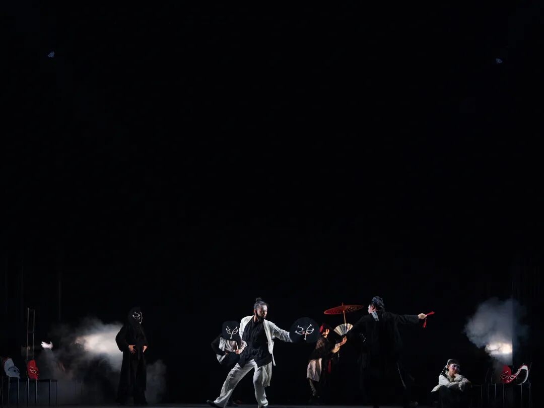 剧中的道具都来自中国古典演剧,如拨浪鼓、扇子、旗帜、伞等,一物多用是一个重要的特色。在其中,扇子合作为兵器展现军队作战,也可以作为男女一见钟情时传递爱情的信物,同时还可以通过演员身段的表演来将扇子化成遮挡的墙壁、烹饪的铁锅、跋涉的拐杖、撑船的船桨等。