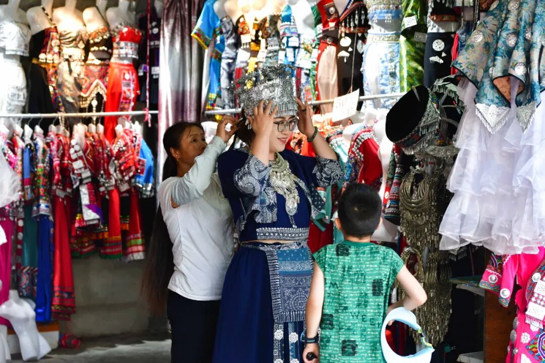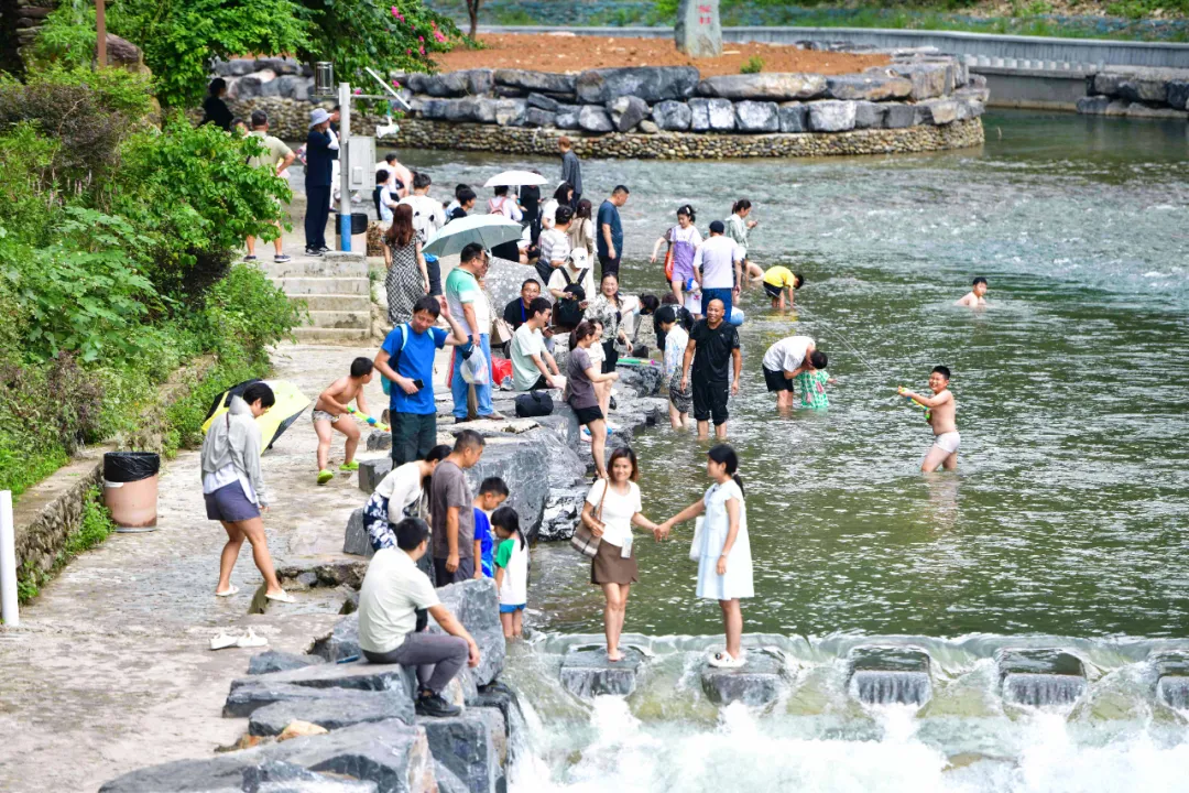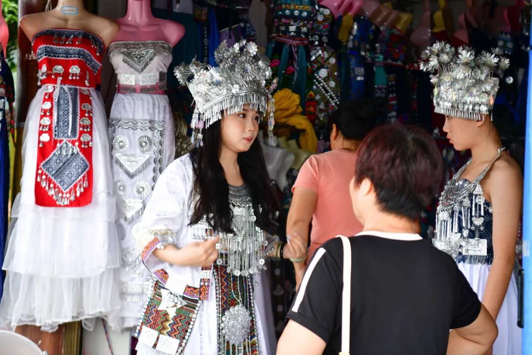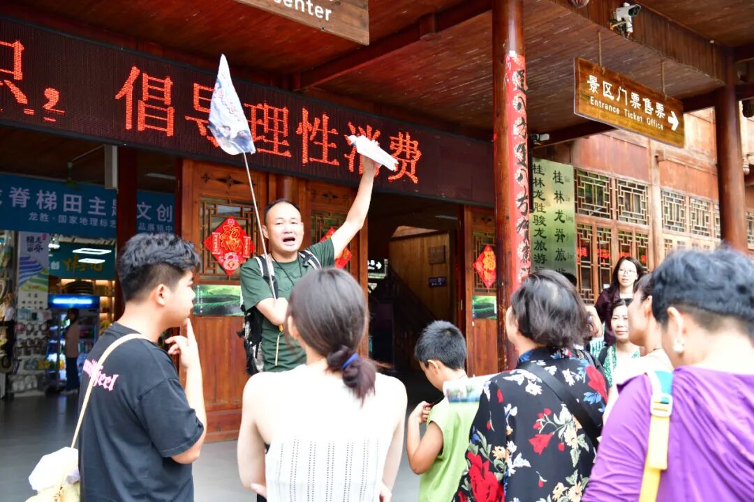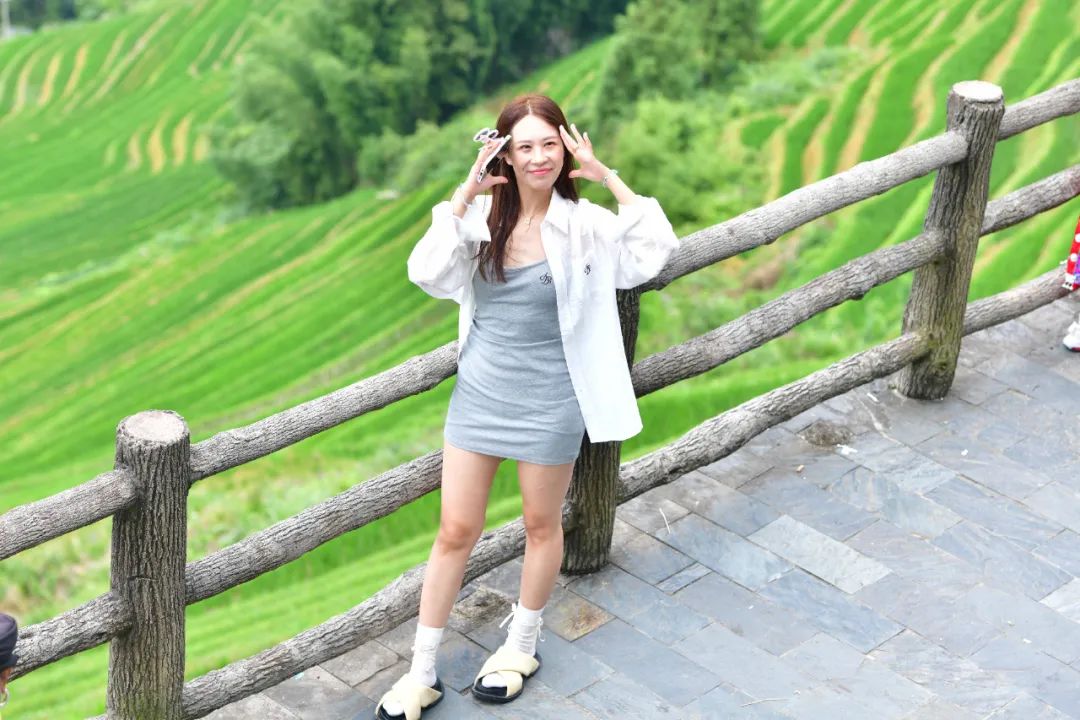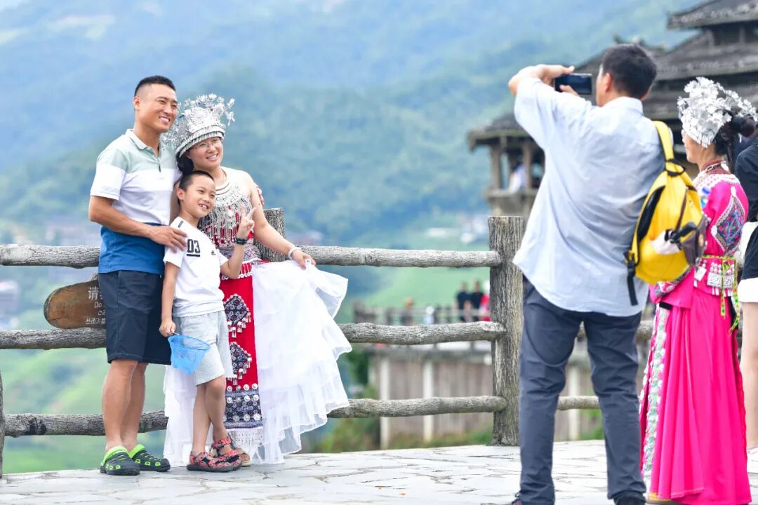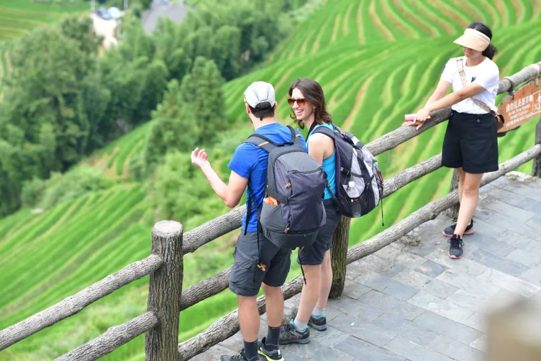 龙脊梯田一直以来都是游客心中的旅游胜地,暑期来临,这里更是成为了避暑休闲的热门选择。在梯田景区观光台,到处是游玩拍照的中外游客,有穿着民族服装打卡拍照的游客,有远道而来的一家人,携老带小、其乐融融,高低错落的翠绿梯田上呈现一派热闹非凡的景象。