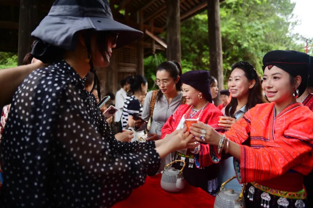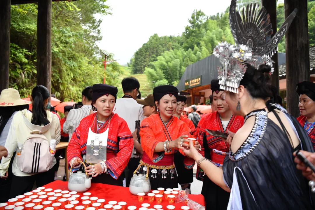 上午10:00 ,瑶族同胞依次列队在大寨风雨桥旁,锣鼓齐鸣、唢呐劲吹,瑶族同胞端起水酒唱起山歌迎接远道而来的八方宾朋。