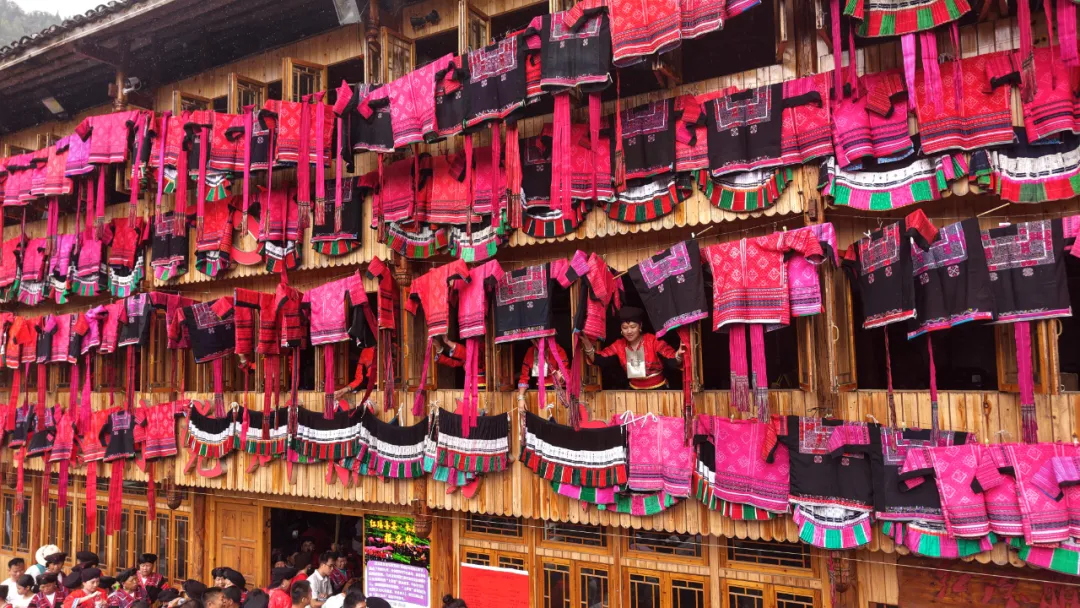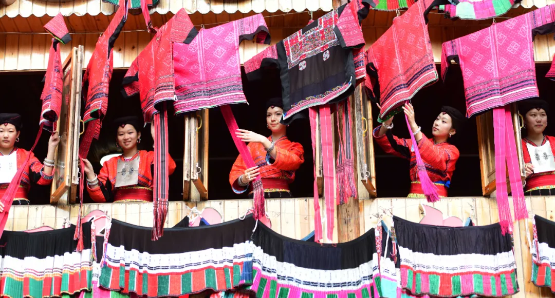 当天清晨,当第一缕阳光穿透薄雾,整个瑶寨便汇入一片红色的暖流。村寨各处,木楼栏杆、晒台之上,红瑶妇女们精心取出珍藏的嫁衣与节日盛装,一件件铺展晾晒。那些凝聚着母亲与祖母心血的土布红衣,在阳光下宛如燃烧的火焰,映衬着青翠梯田,成为天地间最壮丽的画卷。