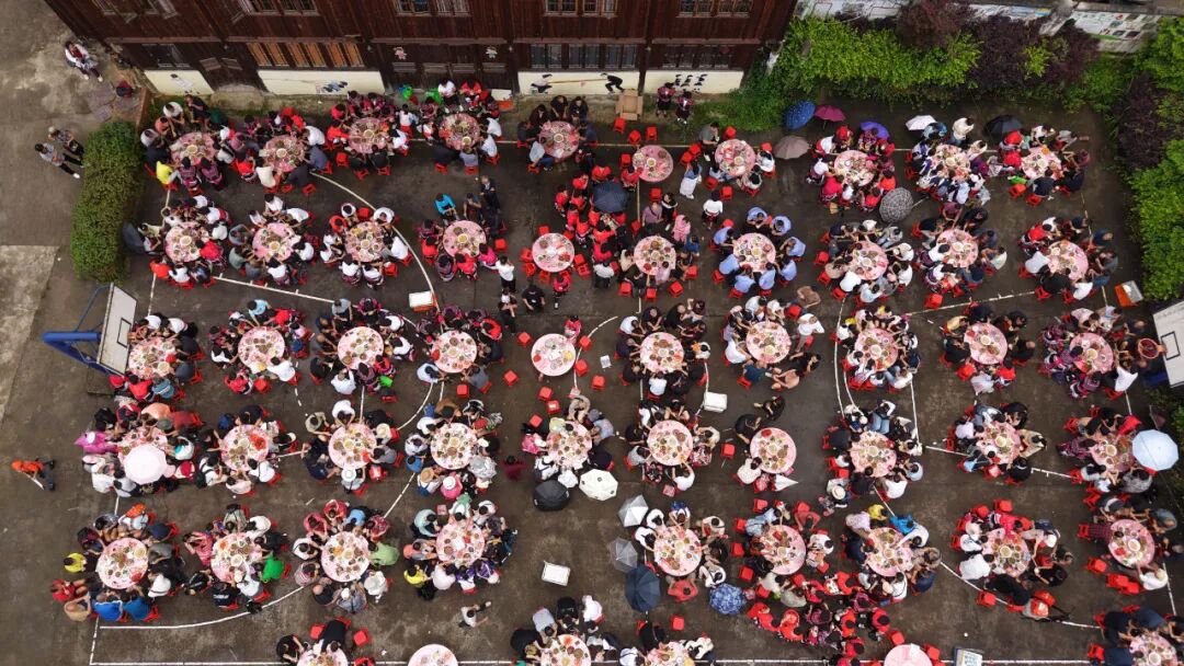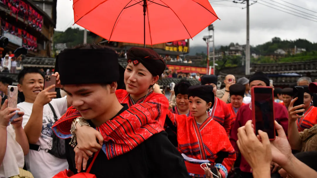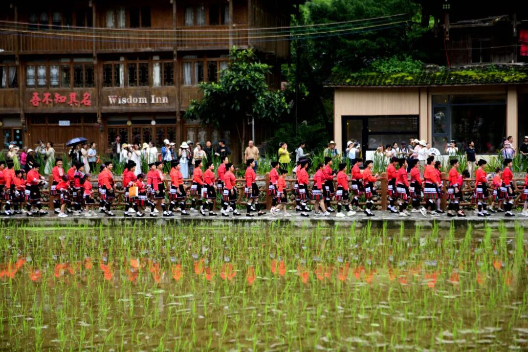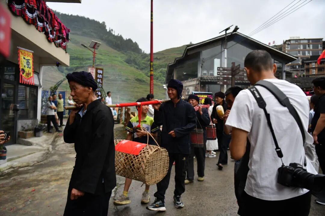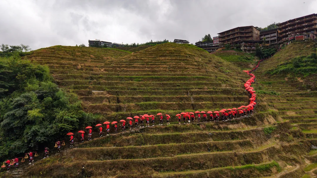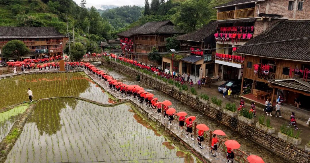 紧接着是最为喜庆而隆重的“红衣定终生”红瑶传统婚礼。送亲队伍从壮届出发,队伍中,新娘走在最前面,紧接着有抬嫁妆、“抬舅公”、肩挑贺礼等,其余的红瑶女子手持红伞,沿着蜿蜒的梯田农耕小道依次缓慢行进。在到达大寨村歌舞场时,红瑶阿嫂还唱起“拦路歌”迎接送亲队伍。接着,村里德高望重的寨老在歌舞场内为新人举行庄重的结婚仪式,一场特别的婚礼在广大游客和亲朋好友的祝福与见证中礼成。
