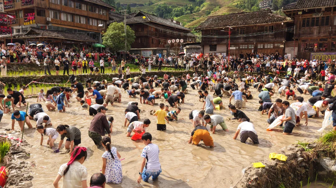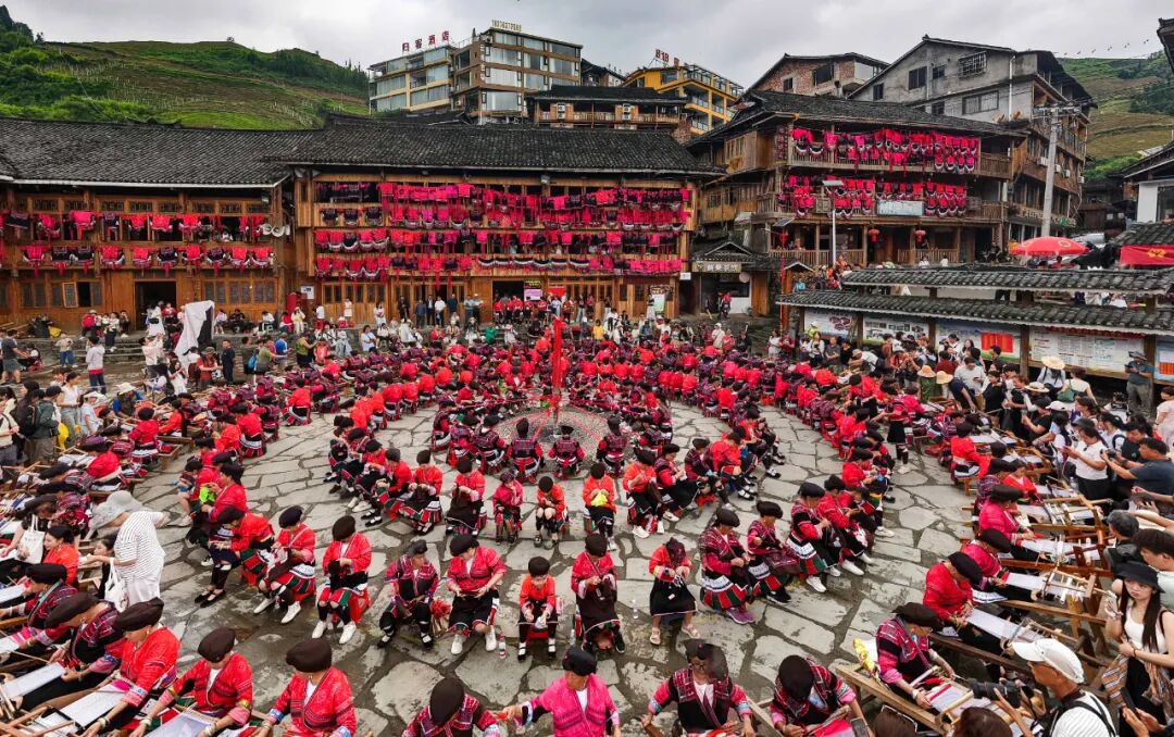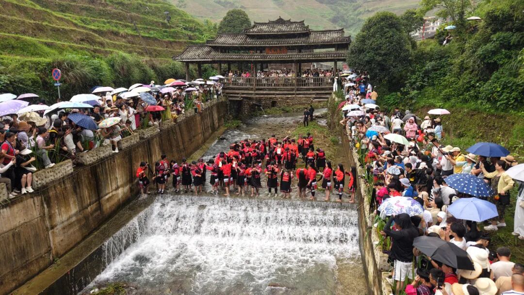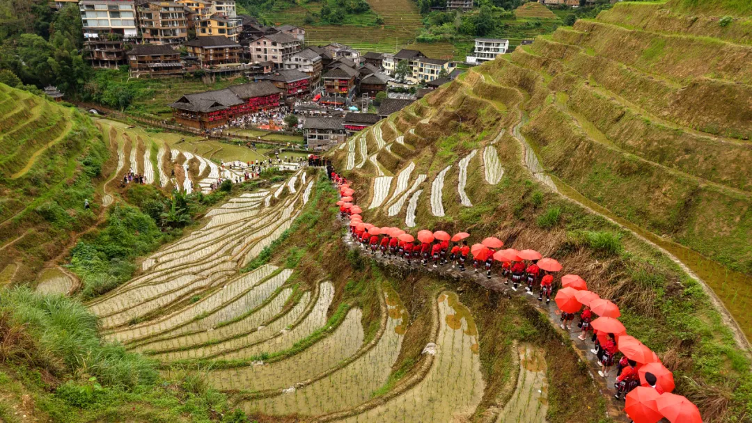 瑶寨红衣晾晒,梯田嘉禾吐翠,6月30日(农历六月初六),一年一度晒衣节在联合国世界旅游组织最佳旅游乡村—龙脊镇大寨村如期举行,唢呐锣鼓迎宾、“红衣晒红半边天”、“抬金狗”送祝福、百名瑶嫂长发梳妆、红瑶传统婚礼、民俗巡游、国家级非物质文化遗产—红瑶服饰制作技艺展示、红瑶喜宴等精彩民俗活动应接不暇,吸引众多中外游客前来参与体验,感受龙胜多彩的民族风情。