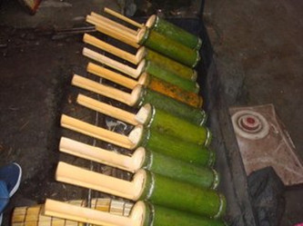 调整火势,小火慢慢烧,翻得勤些较好,不使竹筒燃烧为宜。30至40分钟,竹子水分全部进入糯米内部,可以开饭了!