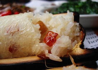 竹筒饭,顾名思义就是用竹筒代锅煮成的米饭。做法是,把洗好的米配适量的山溪水置两头有节的竹筒中(最后用红薯做盖塞紧),再把竹筒置明火上烧烤,待外竹皮烧得焦糊,竹筒内的米饭熟透。此时趁热破开竹筒取饭食用,那股山野竹香味是十分浓郁诱人的,被称之为“绿色米饭”。