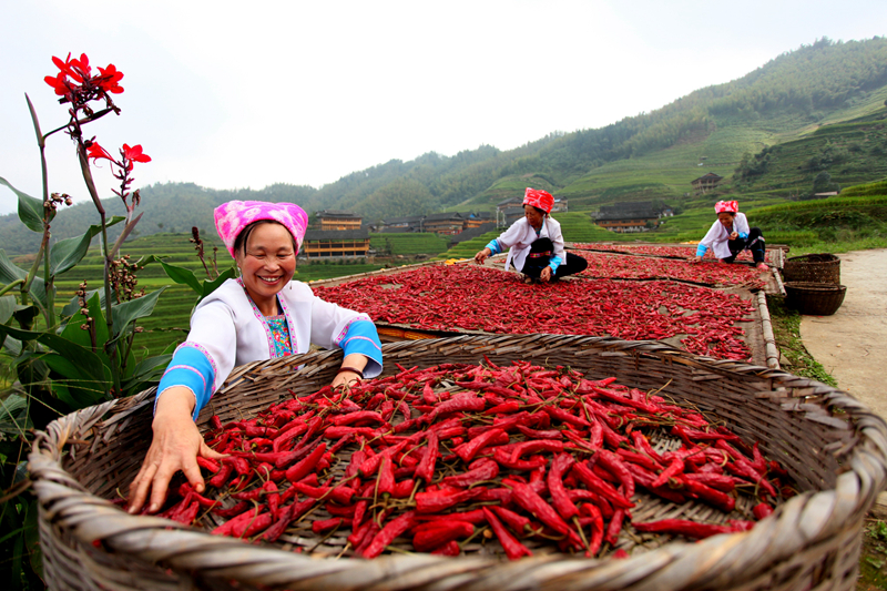 龙脊辣椒产于广西壮族自治区桂林龙胜县龙脊梯田景区一带海拔800 米以上的云雾山中,椒呈牛角形,颜色鲜艳、肉厚籽少、辣味浓、香味独特诱人,除富含辣椒素和挥发性芳香油外,还含多种人体所需的维生素,食后开胃提神,驱寒除湿,增进食欲,是独特的佐料佳品,也是龙脊四宝之一。龙脊辣椒全年生育期180-210 天,株高80-95cm,开展度44.2cm 左右,果长6.5-8.5cm,宽1.5cm,肉厚0.2cm,单果重6-7.5g,产量高。龙脊辣椒除鲜食外,还可加工成干辣椒、椒粉、椒油、辣椒酱、淹制酸椒,鲜产品、成品、半成品畅销全国各地。根据《农产品地理标志管理办法》规定,经过初审、专家评审和公示,中华人民共和国农业部认定龙脊辣椒符合农产品地理标志登记程序和条件,准予登记,2013 年4 月15 日,颁发中华人民共和国农产品地理标志登记证书。