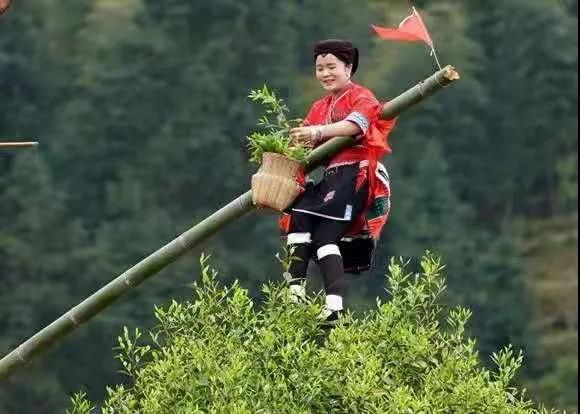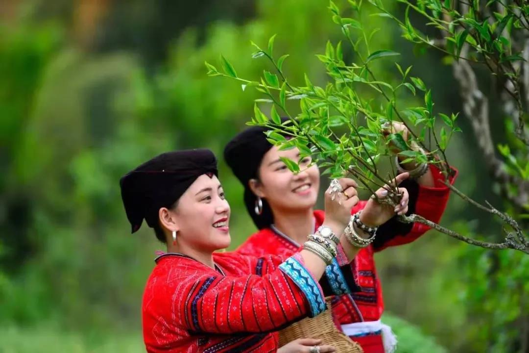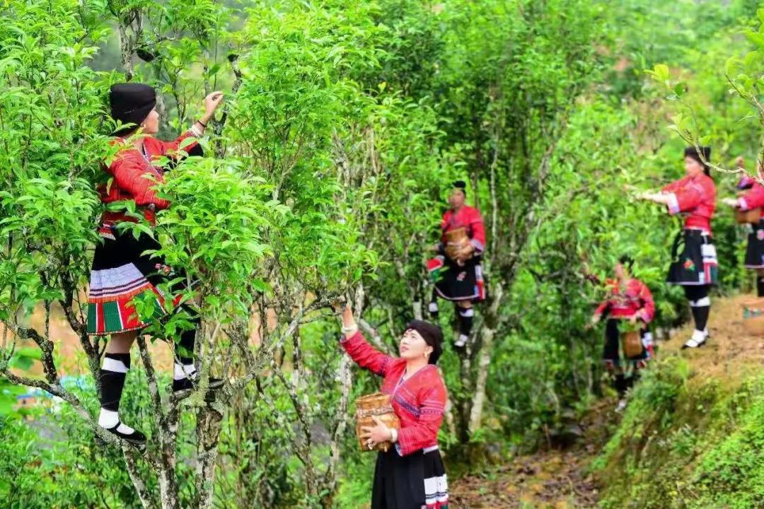 高高的古树茶给采茶带来了挑战。龙脊人唱着山歌来采摘:“情妹采茶在树尖,脚踩茶蔸手攀天,茶叶云雾一起采,树枝弹弹哥心弹……”无论是红瑶姑娘还是壮家女子,个个身轻如燕,手脚灵敏。采摘健康向上的阳春之气,也采集这里未被修改过的田园诗韵律。