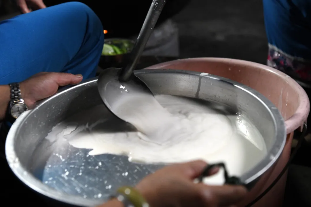 记者来到苏艳梅家中,几个苗嫂正忙得不亦乐乎。“芭蕉芋淀粉按比例与水混合搅拌稀糊状,不能太稠也不能太稀,这是芭蕉芋粉制作的关键,还得不停的搅拌,避免淀粉二次沉淀。”苏艳梅一边搅拌一边介绍说。“水开了,蒸粉咯。”阿嫂们立刻将淀粉液用勺子舀进平底盘中摊匀,再将平底盘放至开水水面上,这活儿看似简单实则不易,要不停晃动,否则淀粉浆迅速凝结,会导致粉条厚度不均。烫熟以后过一遍凉水,就可以晾起来了。