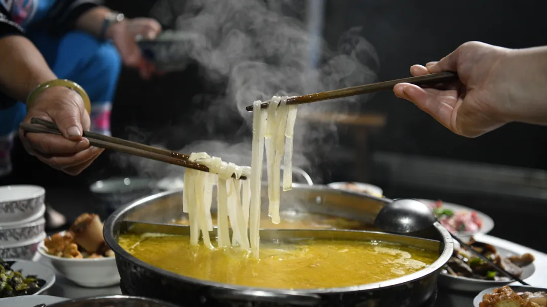到了饭点,柴火灶上煮一锅土鸡汤,下入芭蕉芋粉,芭蕉芋粉晶莹透明、入口润滑、爽口、清香,Q弹软糯的粉吸收足够的汤汁,吃到嘴里有筋道,简直人间至味。“芭蕉芋粉是我们冬日里餐桌上最常见的食材,新鲜的芭蕉芋粉配上一桌好菜,大家一起品尝,开心又幸福。”阿嫂吴秋梅介绍道。