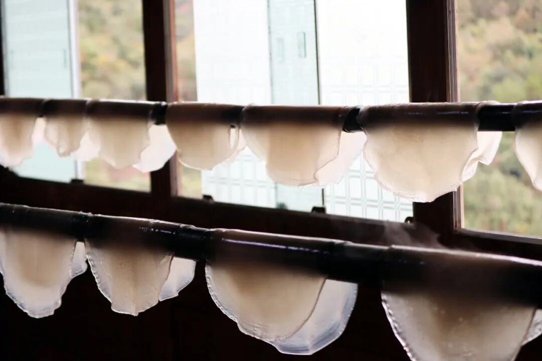 阿嫂在堂屋里挂上两根竹竿,烫熟的粉坯就这样晾上去。现在已是农历十月底,山中的风带着阵阵寒意,晶莹剔透的粉坯在风中慢慢变了颜色、变得硬挺。待到粉坯晾好,阿嫂们便将粉坯卷成卷,再切成一指宽的条,这就是大家都爱吃的芭蕉芋粉了。