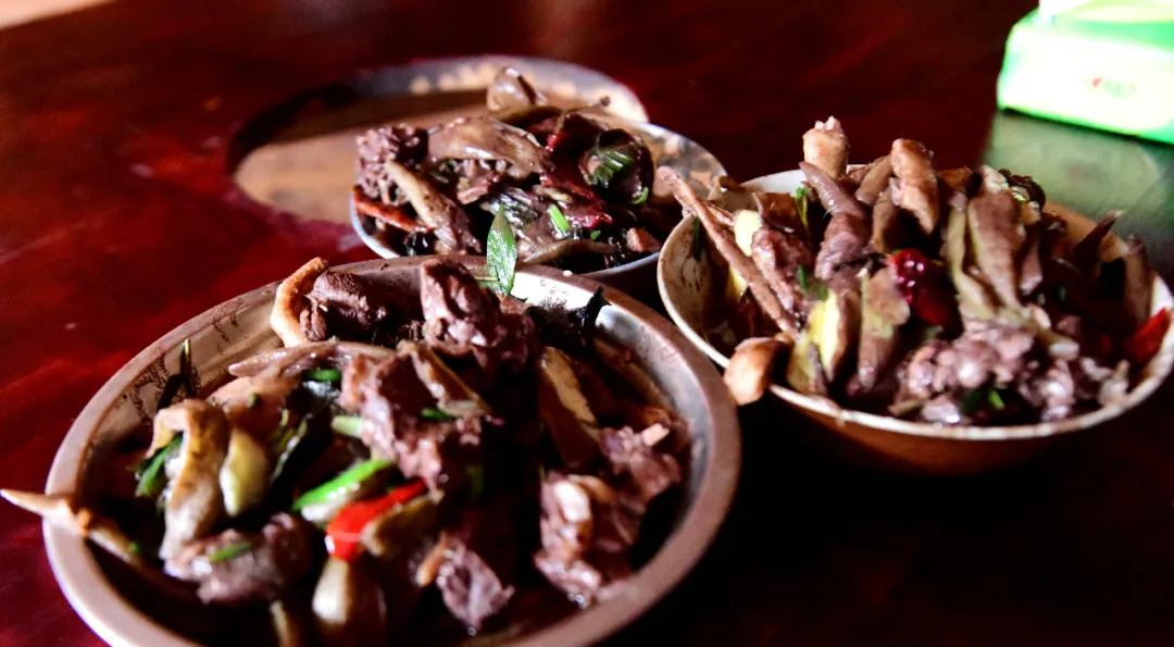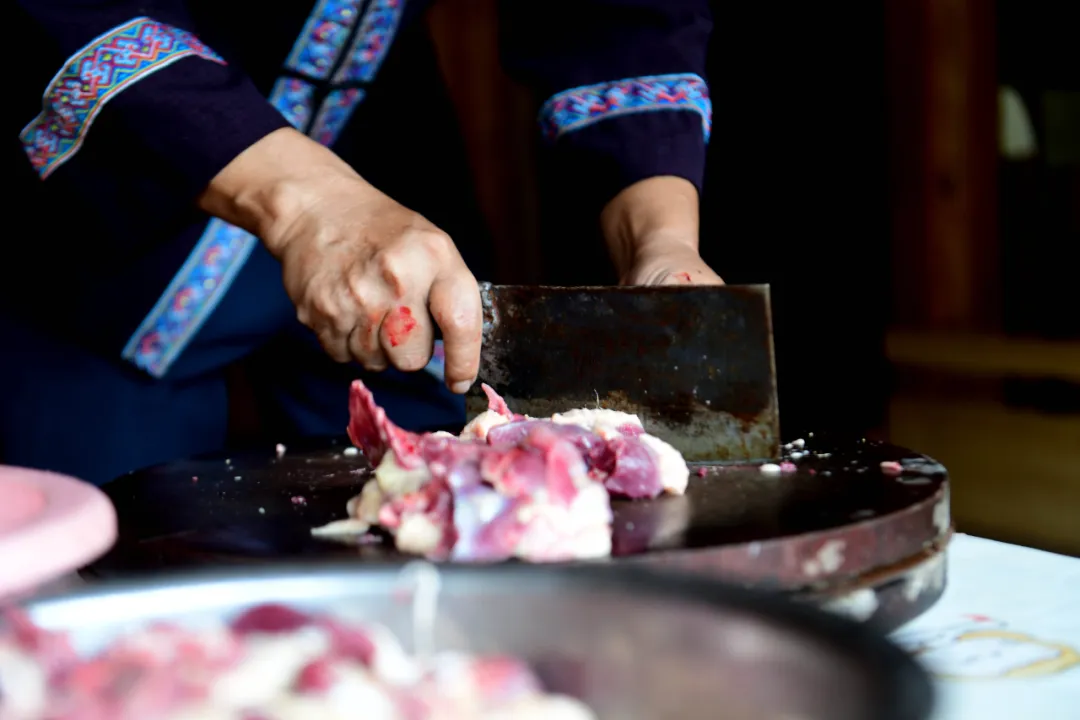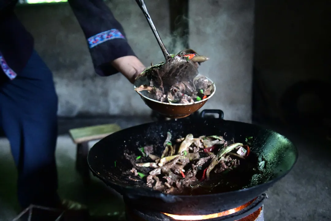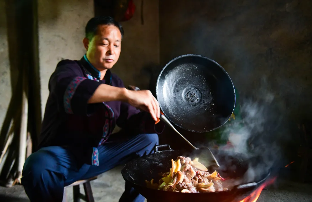 来到韦彦权家,韦大叔已经开始了准备工作。他将宰杀好的鸭子切成大小均匀的块状,老姜切成薄片,锅中倒入菜籽油,待油热后,将鸭块、姜片配合整段的龙脊辣椒一同放入锅中,中大火快速煎炒。在“滋滋”的声响中,鸭肉的油脂逐渐渗出,姜片与辣椒的香味充分释放,厨房被鸭油的香气包裹。待鸭肉表面微微焦黄时,韦大叔往锅中倒入龙脊水酒,酒水漫至鸭肉的二分之一处,放盐调味。很快,酒的醇厚与鸭肉的鲜香交织,随着蒸汽升腾,令人垂涎欲滴。韦大叔盖上锅盖,小火焖烧,让鸭肉在酒的浸润下慢慢吸收香味,变得软烂入味。